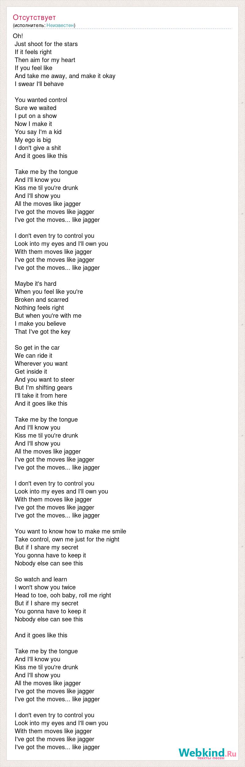 Oh! Just shoot for the stars If it feels right Then aim for my heart If you feel like And take me away, and make it okay I swear I'll behave You wanted control Sure we waited I put on a show Now I make it You say I'm a kid My ego is big I don't give a [bad word] And it goes like this Take me by the tongue And I'll know you Kiss me til you're [bad word] And I'll show you All the moves like jagger I've got the moves like jagger I've got the moves... like jagger I don't even try to control you Look into my eyes and I'll own you With them moves like jagger I've got the moves like jagger I've got the moves... like jagger Maybe it's hard When you feel like you're Broken and scarred Nothing feels right But when you're with me I make you believe That I've got the key So get in the car We can ride it Wherever you want Get inside it And you want to steer But I'm shifting gears I'll take it from here And it goes like this Take me by the tongue And I'll know you Kiss me til you're [bad word] And I'll show you All the moves like jagger I've got the moves like jagger I've got the moves... like jagger I don't even try to control you Look into my eyes and I'll own you With them moves like jagger I've got the moves like jagger I've got the moves... like jagger You want to know how to make me smile Take control, own me just for the night But if I share my secret You gonna have to keep it Nobody else can see this So watch and learn I won't show you twice Head to toe, ooh baby, roll me right But if I share my secret You gonna have to keep it Nobody else can see this And it goes like this Take me by the tongue And I'll know you Kiss me til you're [bad word] And I'll show you All the moves like jagger I've got the moves like jagger I've got the moves... like jagger I don't even try to control you Look into my eyes and I'll own you With them moves like jagger I've got the moves like jagger I've got the moves... like jagger