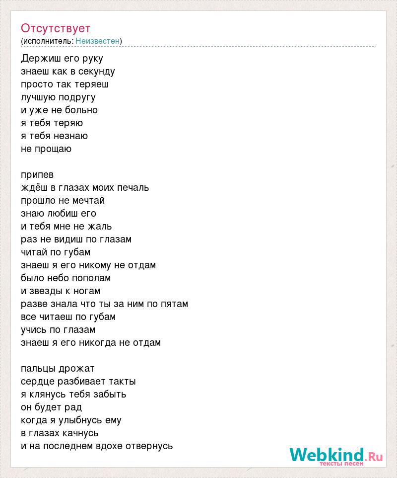 Держиш его руку знаеш как в секунду просто так теряеш лучшую подругу и уже не больно я тебя теряю я тебя незнаю не прощаю припев ждёш в глазах моих печаль прошло не мечтай знаю любиш его и тебя мне не жаль раз не видиш по глазам читай по губам знаеш я его никому не отдам было небо пополам и звезды к ногам разве знала что ты за ним по пятам все читаеш по губам учись по глазам знаеш я его никогда не отдам пальцы дрожат сердце разбивает такты я клянусь тебя забыть он будет рад когда я улыбнусь ему в глазах качнусь и на последнем вдохе отвернусь