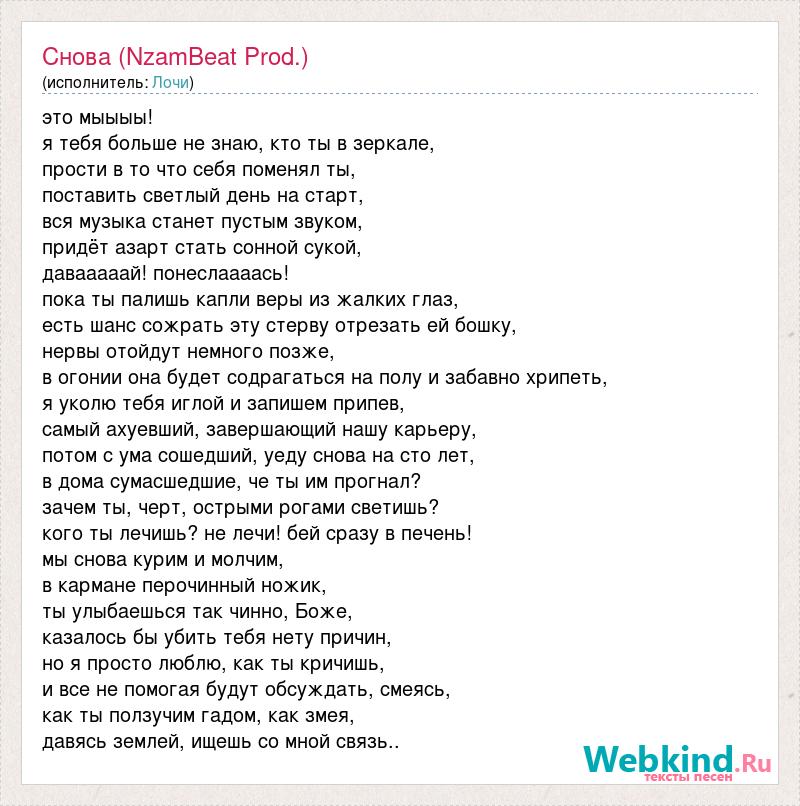 это мыыыы! я тебя больше не знаю, кто ты в зеркале, прости в то что себя поменял ты, поставить светлый день на старт, вся музыка станет пустым звуком, придёт азарт стать сонной сукой, давааааай! понеслаааась! пока ты палишь капли веры из жалких глаз, есть шанс сожрать эту стерву отрезать ей бошку, нервы отойдут немного позже, в огонии она будет содрагаться на полу и забавно хрипеть, я уколю тебя иглой и запишем припев, самый ахуевший, завершающий нашу карьеру, потом с ума сошедший, уеду снова на сто лет, в дома сумасшедшие, че ты им прогнал? зачем ты, черт, острыми рогами светишь? кого ты лечишь? не лечи! бей сразу в печень! мы снова курим и молчим, в кармане перочинный ножик, ты улыбаешься так чинно, Боже, казалось бы убить тебя нету причин, но я просто люблю, как ты кричишь, и все не помогая будут обсуждать, смеясь, как ты ползучим гадом, как змея, давясь землей, ищешь со мной связь..