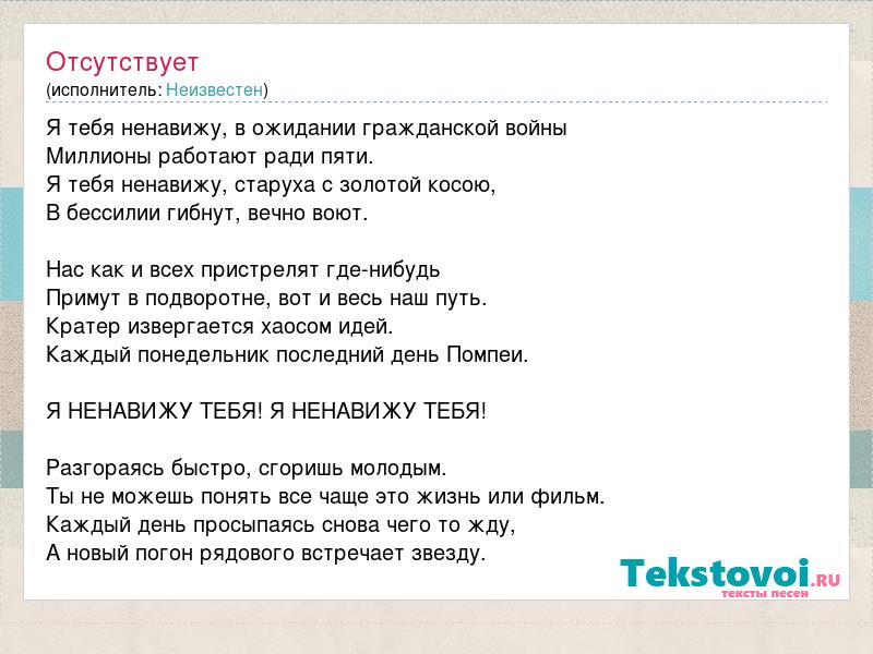 Я тебя ненавижу, в ожидании гражданской войны Миллионы работают ради пяти. Я тебя ненавижу, старуха с золотой косою, В бессилии гибнут, вечно воют. Нас как и всех пристрелят где-нибудь Примут в подворотне, вот и весь наш путь. Кратер извергается хаосом идей. Каждый понедельник последний день Помпеи. Я НЕНАВИЖУ ТЕБЯ! Я НЕНАВИЖУ ТЕБЯ! Разгораясь быстро, сгоришь молодым. Ты не можешь понять все чаще это жизнь или фильм. Каждый день просыпаясь снова чего то жду, А новый погон рядового встречает звезду.