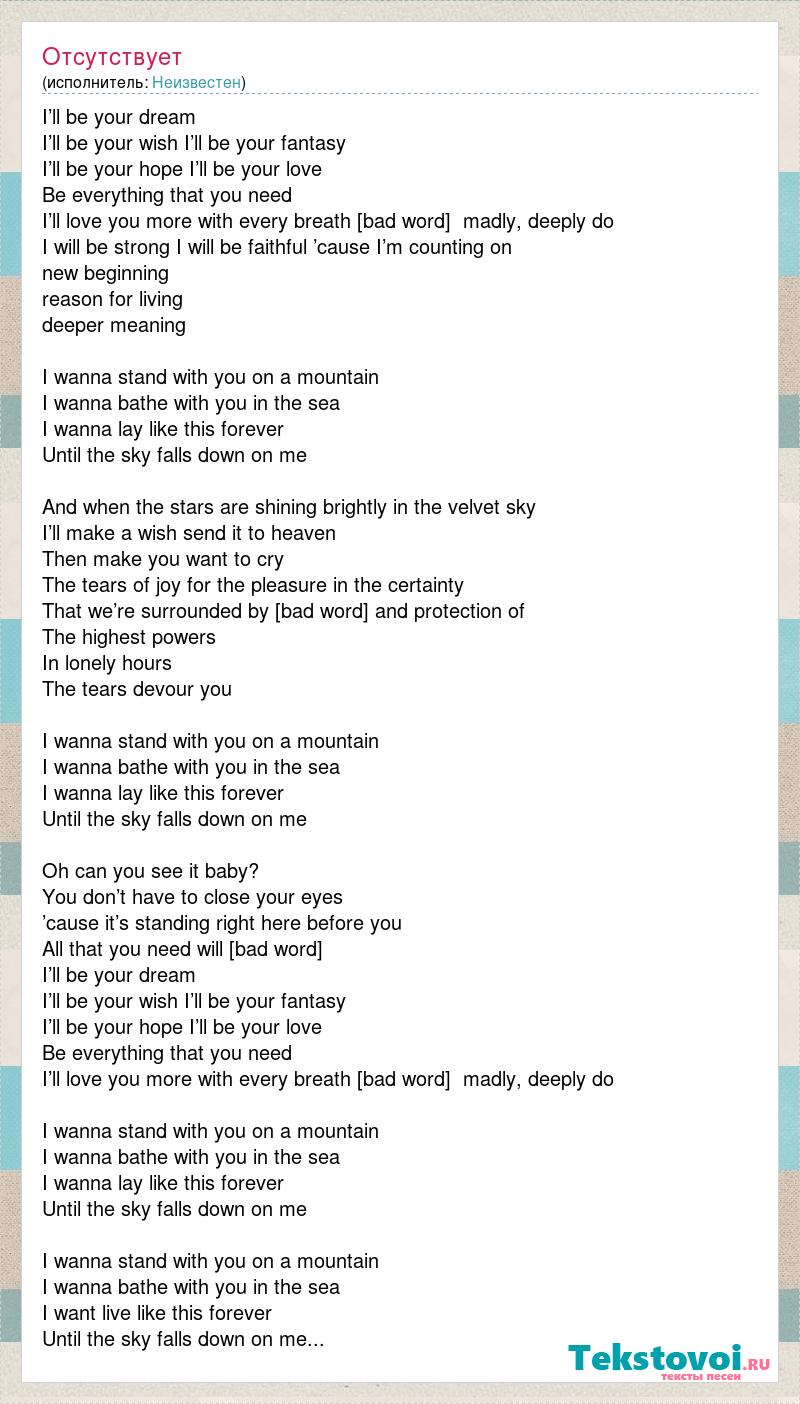 I’ll be your dream I’ll be your wish I’ll be your fantasy I’ll be your hope I’ll be your love Be everything that you need I’ll love you more with every breath [bad word] madly, deeply do I will be strong I will be faithful ’cause I’m counting on new beginning reason for living deeper meaning I wanna stand with you on a mountain I wanna bathe with you in the sea I wanna lay like this forever Until the sky falls down on me And when the stars are shining brightly in the velvet sky I’ll make a wish send it to heaven Then make you want to cry The tears of joy for the pleasure in the certainty That we’re surrounded by [bad word] and protection of The highest powers In lonely hours The tears devour you I wanna stand with you on a mountain I wanna bathe with you in the sea I wanna lay like this forever Until the sky falls down on me Oh can you see it baby? You don’t have to close your eyes ’cause it’s standing right here before you All that you need will [bad word] I’ll be your dream I’ll be your wish I’ll be your fantasy I’ll be your hope I’ll be your love Be everything that you need I’ll love you more with every breath [bad word] madly, deeply do I wanna stand with you on a mountain I wanna bathe with you in the sea I wanna lay like this forever Until the sky falls down on me I wanna stand with you on a mountain I wanna bathe with you in the sea I want live like this forever Until the sky falls down on me...
