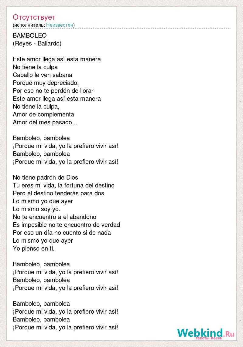 BAMBOLEO (Reyes - Ballardo) Este amor llega así esta manera No tiene la culpa Caballo le ven sabana Porque muy depreciado, Por eso no te perdón de llorar Este amor llega así esta manera No tiene la culpa, Amor [bad word] Amor del mes pasado... Bamboleo, bambolea ¡Porque mi vida, yo la prefiero vivir así! Bamboleo, bambolea ¡Porque mi vida, yo la prefiero vivir así! No tiene padrón de Dios Tu eres mi vida, la fortuna del destino Pero el destino tenderás para dos Lo mismo yo que ayer Lo mismo soy yo. No te encuentro a el abandono Es imposible no te encuentro de verdad Por eso un día no cuento si de nada Lo mismo yo que ayer Yo pienso en ti. Bamboleo, bambolea ¡Porque mi vida, yo la prefiero vivir así! Bamboleo, bambolea ¡Porque mi vida, yo la prefiero vivir así! Bamboleo, bambolea ¡Porque mi vida, yo la prefiero vivir así! Bamboleo, bambolea ¡Porque mi vida, yo la prefiero vivir así!