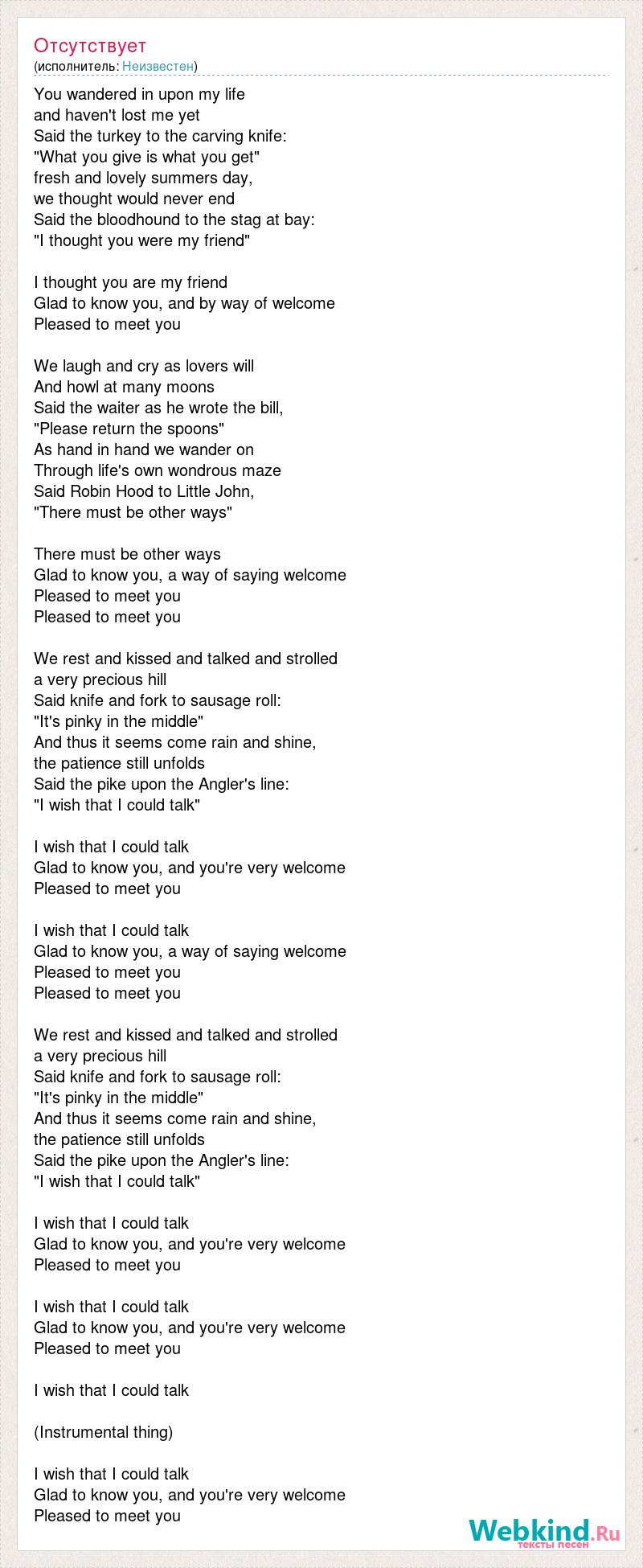 You wandered in upon my life and haven't lost me yet Said the turkey to the carving knife: "What you give is what you get" fresh and lovely summers day, we thought would never end Said the bloodhound to the stag at bay: "I thought you were my friend" I thought you are my friend Glad to know you, and by way of [bad word] Pleased to meet you We laugh and cry as lovers will And howl at many moons Said the waiter as he wrote the bill, "Please return the spoons" As hand in hand we wander on Through life's own wondrous maze Said Robin Hood to Little John, "There must be other ways" There must be other ways Glad to know you, a way of saying [bad word] Pleased to meet you Pleased to meet you We rest and kissed and talked and strolled a very precious hill Said knife and fork to sausage roll: "It's pinky in the middle" And thus it [bad word] rain and shine, the patience still unfolds Said the pike upon the Angler's line: "I wish that I could talk" I wish that I could talk Glad to know you, and you're very [bad word] Pleased to meet you I wish that I could talk Glad to know you, a way of saying [bad word] Pleased to meet you Pleased to meet you We rest and kissed and talked and strolled a very precious hill Said knife and fork to sausage roll: "It's pinky in the middle" And thus it [bad word] rain and shine, the patience still unfolds Said the pike upon the Angler's line: "I wish that I could talk" I wish that I could talk Glad to know you, and you're very [bad word] Pleased to meet you I wish that I could talk Glad to know you, and you're very [bad word] Pleased to meet you I wish that I could talk [bad word] thing) I wish that I could talk Glad to know you, and you're very [bad word] Pleased to meet you