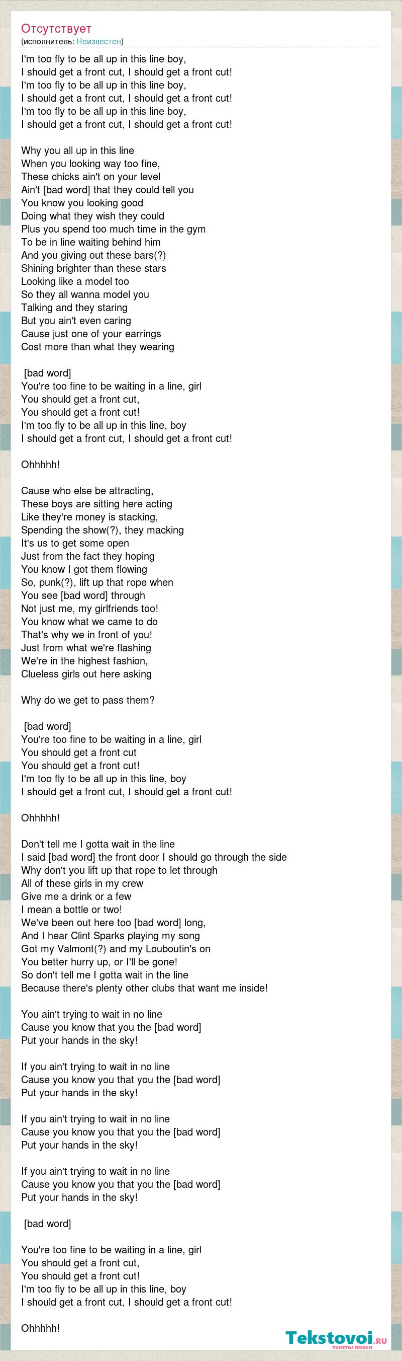 I'm too fly to be all up in this line boy, I should get a front cut, I should get a front cut! I'm too fly to be all up in this line boy, I should get a front cut, I should get a front cut! I'm too fly to be all up in this line boy, I should get a front cut, I should get a front cut! Why you all up in this line When you looking way too fine, These chicks ain't on your level Ain't [bad word] that they could tell you You know you looking good Doing what they wish they could Plus you spend too much time in the gym To be in line waiting behind him And you giving out these bars(?) Shining brighter than these stars Looking like a model too So they all wanna model you Talking and they staring But you ain't even caring Cause just one of your earrings Cost more than what they wearing [bad word] You're too fine to be waiting in a line, girl You should get a front cut, You should get a front cut! I'm too fly to be all up in this line, boy I should get a front cut, I should get a front cut! Ohhhhh! Cause who else be attracting, These boys are sitting here acting Like they're money is stacking, Spending the show(?), they macking It's us to get some open Just from the fact they hoping You know I got them flowing So, punk(?), lift up that rope when You see [bad word] through Not just me, my girlfriends too! You know what we came to do That's why we in front of you! Just from what we're flashing We're in the highest fashion, Clueless girls out here asking Why do we get to pass them? [bad word] You're too fine to be waiting in a line, girl You should get a front cut You should get a front cut! I'm too fly to be all up in this line, boy I should get a front cut, I should get a front cut! Ohhhhh! Don't tell me I gotta wait in the line I said [bad word] the front door I should go through the side Why don't you lift up that rope to let through All of these girls in my crew Give me a drink or a few I mean a bottle or two! We've been out here too [bad word] long, And I hear Clint Sparks playing my song Got my Valmont(?) and my Louboutin's on You better hurry up, or I'll be gone! So don't tell me I gotta wait in the line Because there's plenty other clubs that want me inside! You ain't trying to wait in no line Cause you know that you the [bad word] Put your hands in the sky! If you ain't trying to wait in no line Cause you know you that you the [bad word] Put your hands in the sky! If you ain't trying to wait in no line Cause you know you that you the [bad word] Put your hands in the sky! If you ain't trying to wait in no line Cause you know you that you the [bad word] Put your hands in the sky! [bad word] You're too fine to be waiting in a line, girl You should get a front cut, You should get a front cut! I'm too fly to be all up in this line, boy I should get a front cut, I should get a front cut! Ohhhhh!