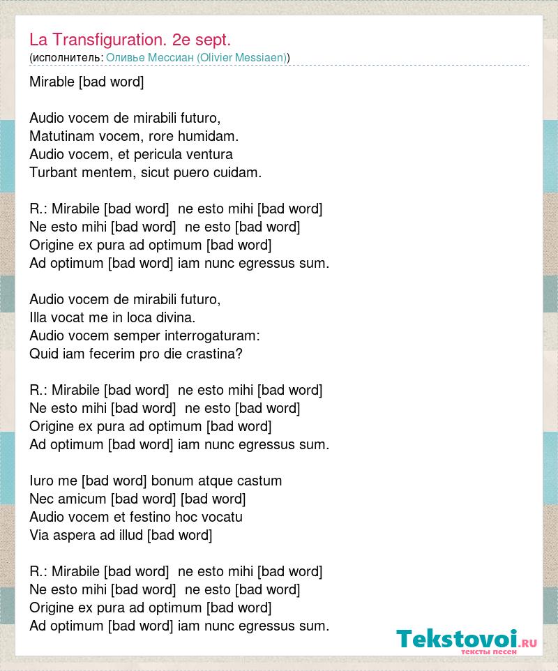 Mirable [bad word] Audio vocem de mirabili futuro, Matutinam vocem, rore humidam. Audio vocem, et pericula ventura Turbant mentem, sicut puero cuidam. R.: Mirabile [bad word] ne esto mihi [bad word] Ne esto mihi [bad word] ne esto [bad word] Origine ex pura ad optimum [bad word] Ad optimum [bad word] iam nunc egressus sum. Audio vocem de mirabili futuro, Illa vocat me in loca divina. Audio vocem semper interrogaturam: Quid iam fecerim pro die crastina? R.: Mirabile [bad word] ne esto mihi [bad word] Ne esto mihi [bad word] ne esto [bad word] Origine ex pura ad optimum [bad word] Ad optimum [bad word] iam nunc egressus sum. Iuro me [bad word] bonum atque castum Nec amicum [bad word] [bad word] Audio vocem et festino hoc vocatu Via aspera ad illud [bad word] R.: Mirabile [bad word] ne esto mihi [bad word] Ne esto mihi [bad word] ne esto [bad word] Origine ex pura ad optimum [bad word] Ad optimum [bad word] iam nunc egressus sum.