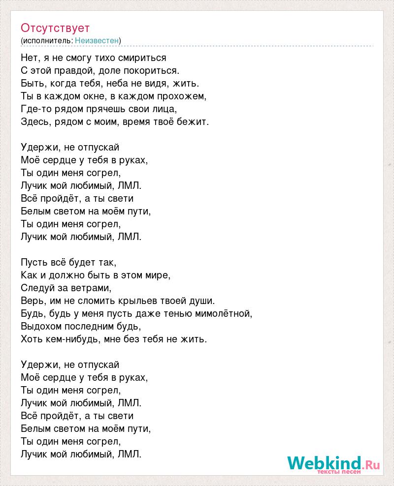 Нет, я не смогу тихо смириться С этой правдой, доле покориться. Быть, когда тебя, неба не видя, жить. Ты в каждом окне, в каждом прохожем, Где-то рядом прячешь свои лица, Здесь, рядом с моим, время твоё бежит. Удержи, не отпускай Моё сердце у тебя в руках, Ты один меня согрел, Лучик мой любимый, ЛМЛ. Всё пройдёт, а ты свети Белым светом на моём пути, Ты один меня согрел, Лучик мой любимый, ЛМЛ. Пусть всё будет так, Как и должно быть в этом мире, Следуй за ветрами, Верь, им не сломить крыльев твоей души. Будь, будь у меня пусть даже тенью мимолётной, Выдохом последним будь, Хоть кем-нибудь, мне без тебя не жить. Удержи, не отпускай Моё сердце у тебя в руках, Ты один меня согрел, Лучик мой любимый, ЛМЛ. Всё пройдёт, а ты свети Белым светом на моём пути, Ты один меня согрел, Лучик мой любимый, ЛМЛ.