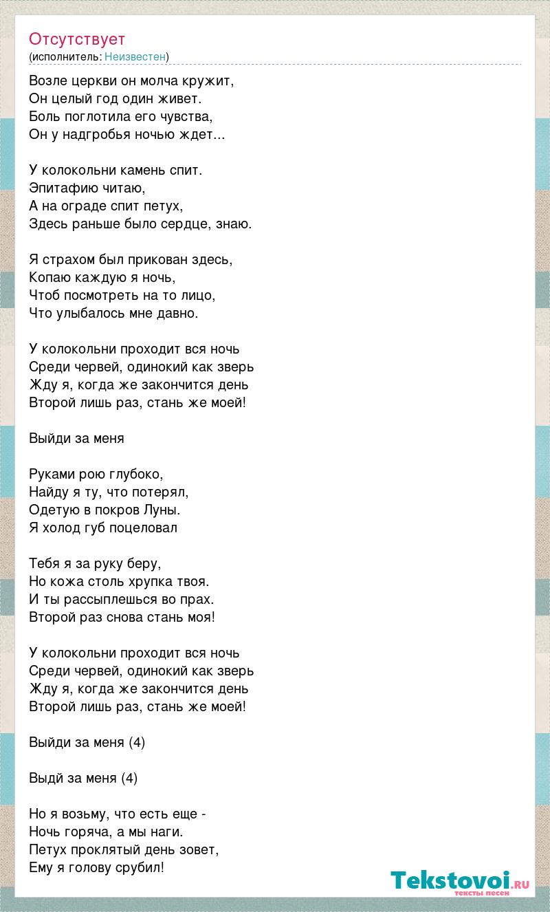Возле церкви он молча кружит, Он целый год один живет. Боль поглотила его чувства, Он у надгробья ночью ждет... У колокольни камень спит. Эпитафию читаю, А на ограде спит петух, Здесь раньше было сердце, знаю. Я страхом был прикован здесь, Копаю каждую я ночь, Чтоб посмотреть на то лицо, Что улыбалось мне давно. У колокольни проходит вся ночь Среди червей, одинокий как зверь Жду я, когда же закончится день Второй лишь раз, стань же моей! Выйди за меня Руками рою глубоко, Найду я ту, что потерял, Одетую в покров Луны. Я холод губ поцеловал Тебя я за руку беру, Но кожа столь хрупка твоя. И ты рассыплешься во прах. Второй раз снова стань моя! У колокольни проходит вся ночь Среди червей, одинокий как зверь Жду я, когда же закончится день Второй лишь раз, стань же моей! Выйди за меня (4) Выдй за меня (4) Но я возьму, что есть еще - Ночь горяча, а мы наги. Петух проклятый день зовет, Ему я голову срубил!