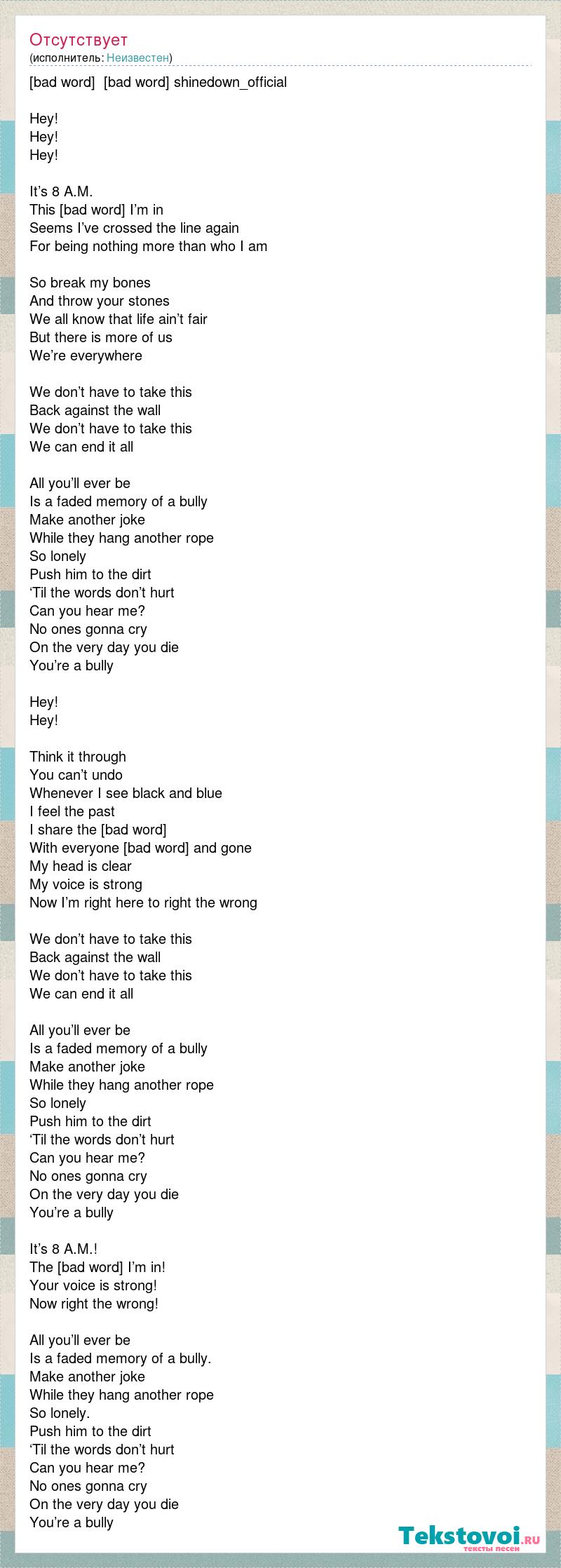 [bad word] [bad word] shinedown_official Hey! Hey! Hey! It’s 8 A.M. This [bad word] I’m in Seems I’ve crossed the line again For being nothing more than who I am So break my bones And throw your stones We all know that life ain’t fair But there is more of us We’re everywhere We don’t have to take this Back against the wall We don’t have to take this We can end it all All you’ll ever be Is a faded memory of a bully Make another joke While they hang another rope So lonely Push him to the dirt ‘Til the words don’t hurt Can you hear me? No ones gonna cry On the very day you die You’re a bully Hey! Hey! Think it through You can’t undo Whenever I see black and blue I feel the past I share the [bad word] With everyone [bad word] and gone My head is clear My voice is strong Now I’m right here to right the wrong We don’t have to take this Back against the wall We don’t have to take this We can end it all All you’ll ever be Is a faded memory of a bully Make another joke While they hang another rope So lonely Push him to the dirt ‘Til the words don’t hurt Can you hear me? No ones gonna cry On the very day you die You’re a bully It’s 8 A.M.! The [bad word] I’m in! Your voice is strong! Now right the wrong! All you’ll ever be Is a faded memory of a bully. Make another joke While they hang another rope So lonely. Push him to the dirt ‘Til the words don’t hurt Can you hear me? No ones gonna cry On the very day you die You’re a bully
