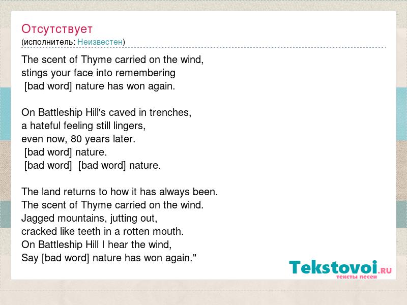 The scent of Thyme carried on the wind, stings your face into remembering [bad word] nature has won again. On Battleship Hill's caved in trenches, a hateful feeling still lingers, even now, 80 years later. [bad word] nature. [bad word] [bad word] nature. The land returns to how it has always been. The scent of Thyme carried on the wind. Jagged mountains, jutting out, cracked like teeth in a rotten mouth. On Battleship Hill I hear the wind, Say [bad word] nature has won again."