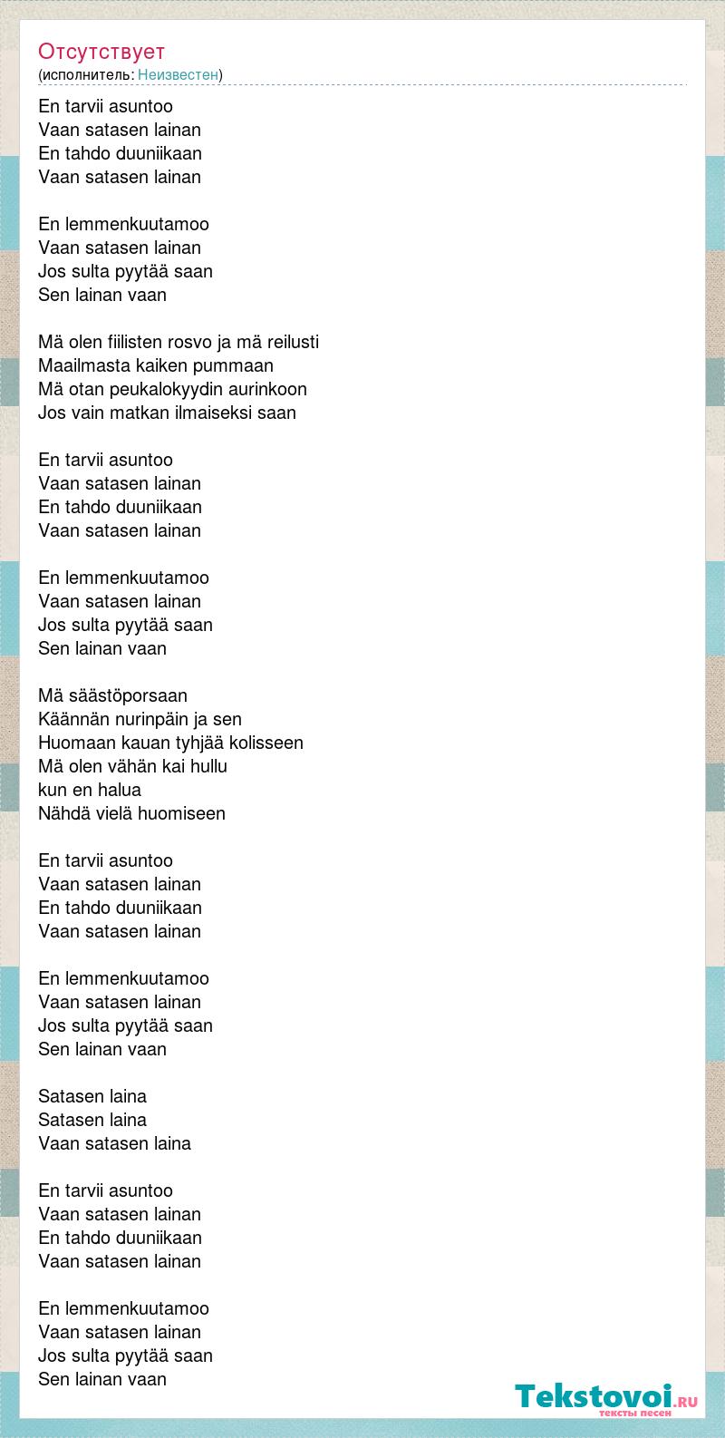 En tarvii asuntoo Vaan satasen lainan En tahdo duuniikaan Vaan satasen lainan En lemmenkuutamoo Vaan satasen lainan Jos sulta pyytää saan Sen lainan vaan Mä olen fiilisten rosvo ja mä reilusti Maailmasta kaiken pummaan Mä otan peukalokyydin aurinkoon Jos vain matkan ilmaiseksi saan En tarvii asuntoo Vaan satasen lainan En tahdo duuniikaan Vaan satasen lainan En lemmenkuutamoo Vaan satasen lainan Jos sulta pyytää saan Sen lainan vaan Mä säästöporsaan Käännän nurinpäin ja sen Huomaan kauan tyhjää kolisseen Mä olen vähän kai hullu kun en halua Nähdä vielä huomiseen En tarvii asuntoo Vaan satasen lainan En tahdo duuniikaan Vaan satasen lainan En lemmenkuutamoo Vaan satasen lainan Jos sulta pyytää saan Sen lainan vaan Satasen laina Satasen laina Vaan satasen laina En tarvii asuntoo Vaan satasen lainan En tahdo duuniikaan Vaan satasen lainan En lemmenkuutamoo Vaan satasen lainan Jos sulta pyytää saan Sen lainan vaan