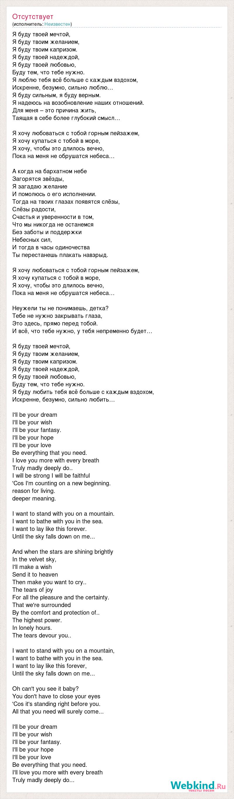 Я буду твоей мечтой, Я буду твоим желанием, Я буду твоим капризом. Я буду твоей надеждой, Я буду твоей любовью, Буду тем, что тебе нужно. Я люблю тебя всё больше с каждым вздохом, Искренне, безумно, сильно люблю… Я буду сильным, я буду верным. Я надеюсь на возобновление наших отношений. Для меня – это причина жить, Таящая в себе более глубокий смысл… Я хочу любоваться с тобой горным пейзажем, Я хочу купаться с тобой в море, Я хочу, чтобы это длилось вечно, Пока на меня не обрушатся небеса… А когда на бархатном небе Загорятся звёзды, Я загадаю желание И помолюсь о его исполнении. Тогда на твоих глазах появятся слёзы, Слёзы радости, Счастья и уверенности в том, Что мы никогда не останемся Без заботы и поддержки Небесных сил, И тогда в часы одиночества Ты перестанешь плакать навзрыд. Я хочу любоваться с тобой горным пейзажем, Я хочу купаться с тобой в море, Я хочу, чтобы это длилось вечно, Пока на меня не обрушатся небеса… Неужели ты не понимаешь, детка? Тебе не нужно закрывать глаза, Это здесь, прямо перед тобой. И всё, что тебе нужно, у тебя непременно будет… Я буду твоей мечтой, Я буду твоим желанием, Я буду твоим капризом. Я буду твоей надеждой, Я буду твоей любовью, Буду тем, что тебе нужно. Я буду любить тебя всё больше с каждым вздохом, Искренне, безумно, сильно любить… I'll be your dream I'll be your wish I'll be your fantasy. I'll be your hope I'll be your love Be everything that you need. I love you more with every breath [bad word] madly deeply do.. I will be strong I will be faithful 'Cos I'm counting on a new beginning. reason for living. deeper meaning. I want to stand with you on a mountain. I want to bathe with you in the sea. I want to lay like this forever. Until the sky falls down on me... And when the stars are shining brightly In the velvet sky, I'll make a wish Send it to heaven Then make you want to cry.. The tears of joy For all the pleasure and the certainty. That we're surrounded By [bad word] and protection of.. The highest power. In lonely hours. The tears devour you.. I want to stand with you on a mountain, I want to bathe with you in the sea. I want to lay like this forever, Until the sky falls down on me... Oh can't you see it baby? You don't have to close your eyes 'Cos it's standing right before you. All that you need will [bad word] .. I'll be your dream I'll be your wish I'll be your fantasy. I'll be your hope I'll be your love Be everything that you need. I'll love you more with every breath [bad word] madly deeply do...