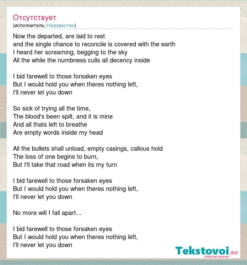 Now the departed, are laid to rest and the single chance to reconcile is covered with the earth I heard her screaming, begging to the sky All the while the numbness culls all decency inside I bid farewell to those forsaken eyes But I would hold you when theres nothing left, I'll never let you down So sick of trying all the time, The blood's been spilt, and it is mine And all thats left to breathe Are empty words inside my head All the bullets shall unload, empty casings, callous hold The loss of one begins to burn, But I'll take that road when its my turn I bid farewell to those forsaken eyes But I would hold you when theres nothing left, I'll never let you down No more will I fall apart... I bid farewell to those forsaken eyes But I would hold you when theres nothing left, I'll never let you down
