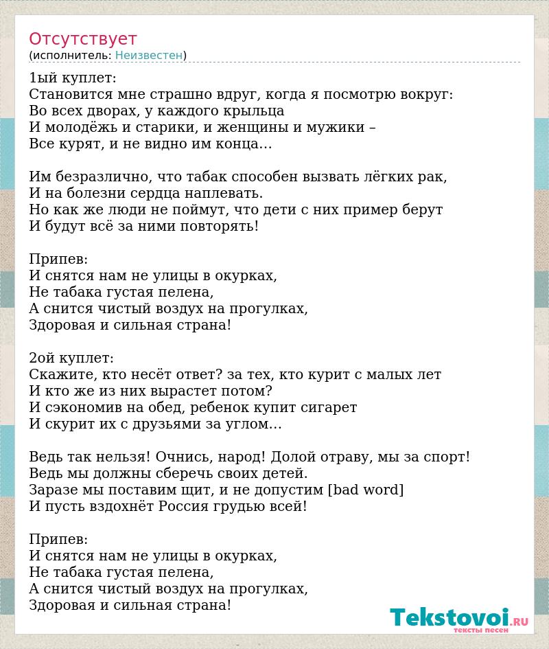 1ый куплет: Становится мне страшно вдруг, когда я посмотрю вокруг: Во всех дворах, у каждого крыльца И молодёжь и старики, и женщины и мужики – Все курят, и не видно им конца… Им безразлично, что табак способен вызвать лёгких рак, И на болезни сердца наплевать. Но как же люди не поймут, что дети с них пример берут И будут всё за ними повторять! Припев: И снятся нам не улицы в окурках, Не табака густая пелена, А снится чистый воздух на прогулках, Здоровая и сильная страна! 2ой куплет: Скажите, кто несёт ответ? за тех, кто курит с малых лет И кто же из них вырастет потом? И сэкономив на обед, ребенок купит сигарет И скурит их с друзьями за углом… Ведь так нельзя! Очнись, народ! Долой отраву, мы за спорт! Ведь мы должны сберечь своих детей. Заразе мы поставим щит, и не допустим [bad word] И пусть вздохнёт Россия грудью всей! Припев: И снятся нам не улицы в окурках, Не табака густая пелена, А снится чистый воздух на прогулках, Здоровая и сильная страна!