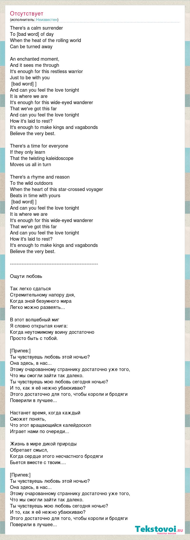 There's a calm surrender To [bad word] of day When the heat of the rolling world Can be turned away An enchanted moment, And it sees me through It's enough for this restless warrior Just to be with you [bad word] ] And can you feel the love tonight It is where we are It's enough for this wide-eyed wanderer That we've got this far And can you feel the love tonight How it's laid to rest? It's enough to make kings and vagabonds Believe the very best. There's a time for everyone If they only learn That the twisting kaleidoscope Moves us all in turn There's a rhyme and reason To the wild outdoors When the heart of this star-crossed voyager Beats in time with yours [bad word] ] And can you feel the love tonight It is where we are It's enough for this wide-eyed wanderer That we've got this far And can you feel the love tonight How it's laid to rest? It's enough to make kings and vagabonds Believe the very best. ----------------------------------------------------- Ощути любовь Так легко сдаться Стремительному напору дня, Когда зной безумного мира Легко можно развеять... В этот волшебный миг Я словно открытая книга: Когда неутомимому воину достаточно Просто быть с тобой. [Припев:] Ты чувствуешь любовь этой ночью? Она здесь, в нас... Этому очарованному страннику достаточно уже того, Что мы смогли зайти так далеко. Ты чувствуешь мою любовь сегодня ночью? И то, как я её нежно убаюкиваю? Этого достаточно для того, чтобы короли и бродяги Поверили в лучшее... Настанет время, когда каждый Сможет понять, Что этот вращающийся калейдоскоп Играет нами по очереди... Жизнь в мире дикой природы Обретает смысл, Когда сердце этого несчастного бродяги Бьется вместе с твоим.... [Припев:] Ты чувствуешь любовь этой ночью? Она здесь, в нас... Этому очарованному страннику достаточно уже того, Что мы смогли зайти так далеко. Ты чувствуешь мою любовь сегодня ночью? И то, как я её нежно убаюкиваю? Этого достаточно для того, чтобы короли и бродяги Поверили в лучшее...