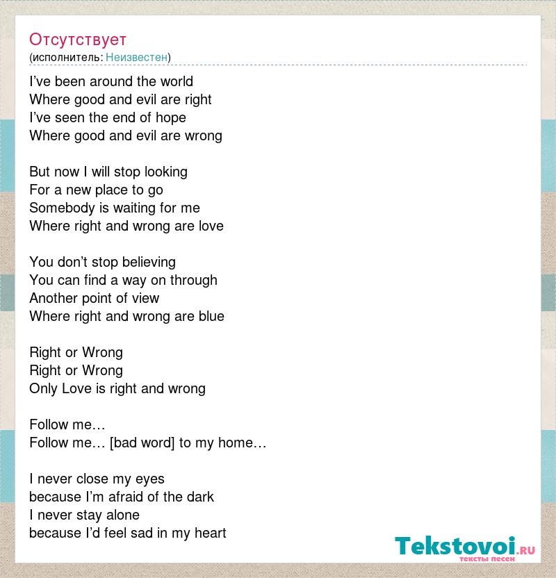 I’ve been around the world Where good and evil are right I’ve seen the end of hope Where good and evil are wrong But now I will stop looking For a new place to go Somebody is waiting for me Where right and wrong are love You don’t stop believing You can find a way on through Another point of view Where right and wrong are blue Right or Wrong Right or Wrong Only Love is right and wrong Follow me… Follow me… [bad word] to my home… I never close my eyes because I’m afraid of the dark I never stay alone because I’d feel sad in my heart