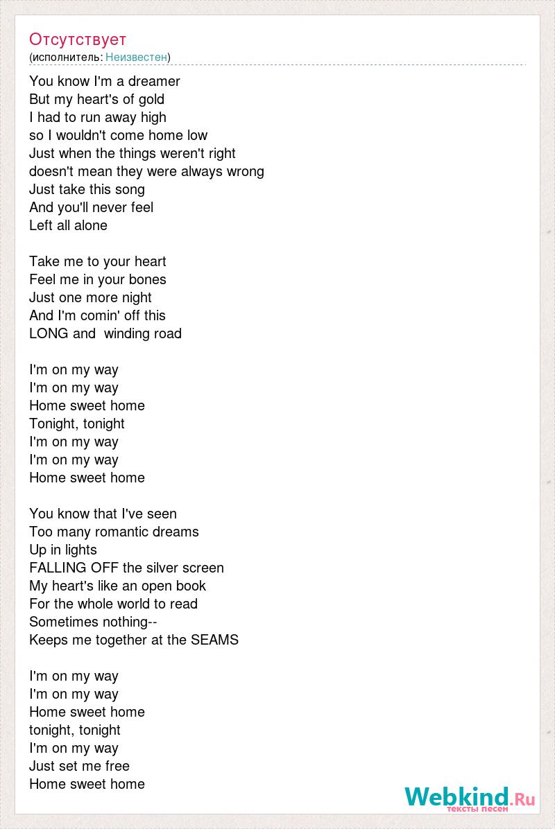 You know I'm a dreamer But my heart's of gold I had [bad word] away high so I [bad word] home low Just when the things weren't right doesn't mean they were always wrong Just take this song And you'll never feel Left all alone Take me to your heart Feel me in your bones Just one more night And [bad word] #39; off this LONG and winding road I'm on my way I'm on my way Home sweet home Tonight, tonight I'm on my way I'm on my way Home sweet home You know that I've seen Too many romantic dreams Up in lights FALLING OFF the silver screen My heart's like an open book For the whole world to read Sometimes nothing-- Keeps me together at the SEAMS I'm on my way I'm on my way Home sweet home tonight, tonight I'm on my way Just set me free Home sweet home