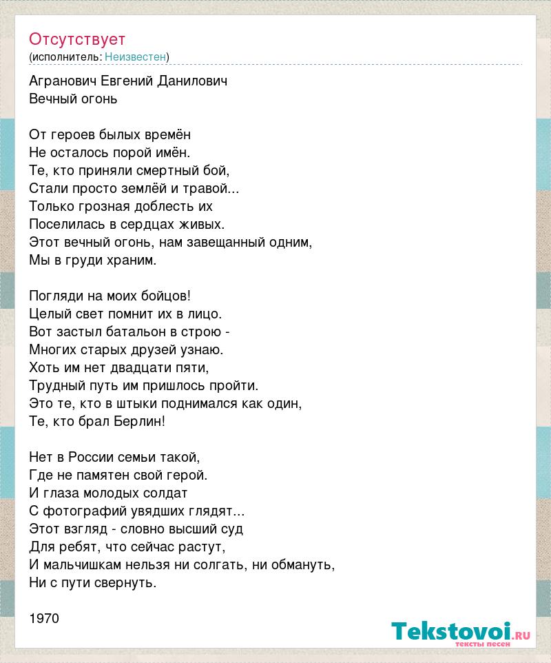 Агранович Евгений Данилович Вечный огонь От героев былых времён Не осталось порой имён. Те, кто приняли смертный бой, Стали просто землёй и травой... Только грозная доблесть их Поселилась в сердцах живых. Этот вечный огонь, нам завещанный одним, Мы в груди храним. Погляди на моих бойцов! Целый свет помнит их в лицо. Вот застыл батальон в строю - Многих старых друзей узнаю. Хоть им нет двадцати пяти, Трудный путь им пришлось пройти. Это те, кто в штыки поднимался как один, Те, кто брал Берлин! Нет в России семьи такой, Где не памятен свой герой. И глаза молодых солдат С фотографий увядших глядят... Этот взгляд - словно высший суд Для ребят, что сейчас растут, И мальчишкам нельзя ни солгать, ни обмануть, Ни с пути свернуть. 1970