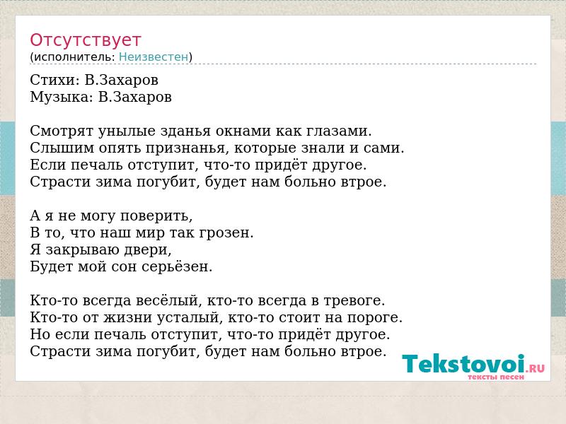 Стихи: В.Захаров Музыка: В.Захаров Смотрят унылые зданья окнами как глазами. Слышим опять признанья, которые знали и сами. Если печаль отступит, что-то придёт другое. Страсти зима погубит, будет нам больно втрое. А я не могу поверить, В то, что наш мир так грозен. Я закрываю двери, Будет мой сон серьёзен. Кто-то всегда весёлый, кто-то всегда в тревоге. Кто-то от жизни усталый, кто-то стоит на пороге. Но если печаль отступит, что-то придёт другое. Страсти зима погубит, будет нам больно втрое.