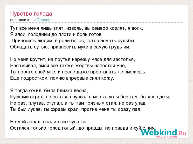 Тут все меня лишь злят, изволь, вы семеро козлят, я волк. Я злой, голодный до плоти и боль готов, Приносить людям, в роли богов, готов ломать судьбы, Обладать сутью, привносить муки в самую грудь им. Но меня крутит, на прутья нарезку мяса для застолья, Насаживал, эмси все также жертвы напостой мне, Ты просто спой мне, и после даже простонать не сможешь, Еще подростком, помню впрервые снял кожу, Я тогда ожил, была близка весна, Кусками страх, не остывав пускал в места, хотя бес там бывал, где я, Не раз, плутав, ступал, а ты там грязным стал, не раз упав, Ты был лукав, ты фразы крал, против меня ты сразу пал. Но мой запал, спалил все чувства, Остался только голод голый, до правды, но правда и хуй с ним.