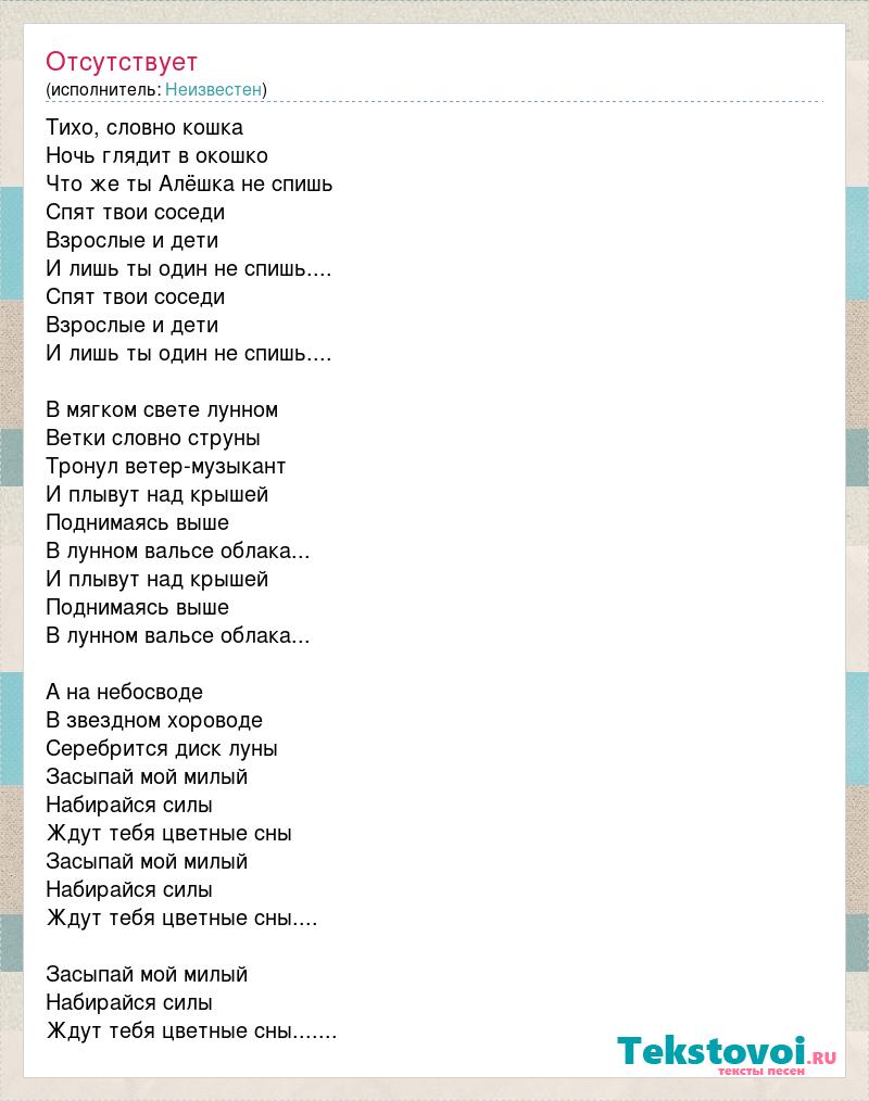 Тихо, словно кошка Ночь глядит в окошко Что же ты Алёшка не спишь Спят твои соседи Взрослые и дети И лишь ты один не спишь.... Спят твои соседи Взрослые и дети И лишь ты один не спишь.... В мягком свете лунном Ветки словно струны Тронул ветер-музыкант И плывут над крышей Поднимаясь выше В лунном вальсе облака... И плывут над крышей Поднимаясь выше В лунном вальсе облака... А на небосводе В звездном хороводе Серебрится диск луны Засыпай мой милый Набирайся силы Ждут тебя цветные сны Засыпай мой милый Набирайся силы Ждут тебя цветные сны.... Засыпай мой милый Набирайся силы Ждут тебя цветные сны.......