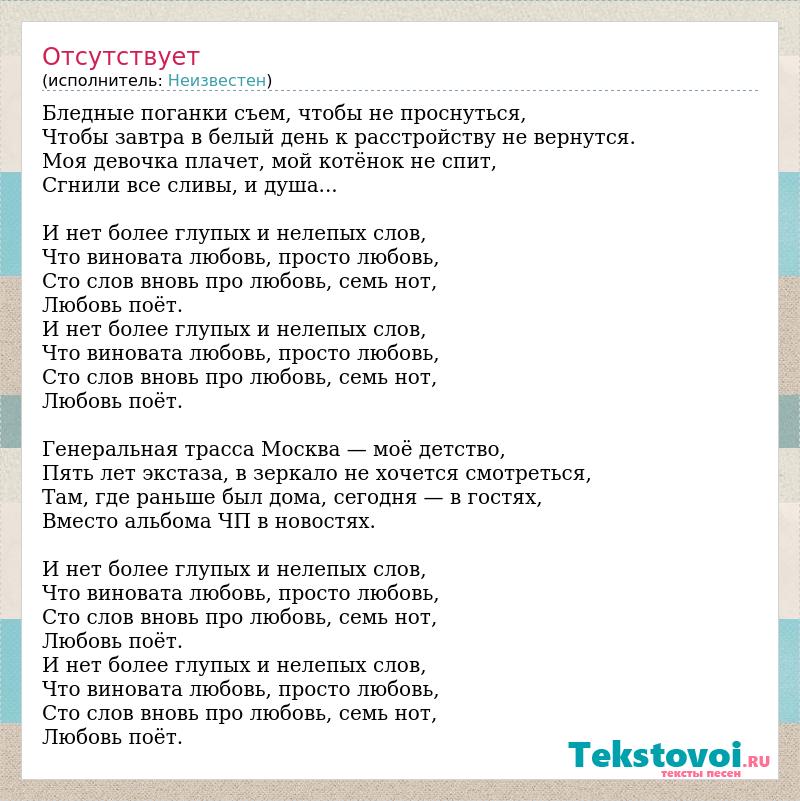 Бледные поганки съем, чтобы не проснуться, Чтобы завтра в белый день к расстройству не вернутся. Моя девочка плачет, мой котёнок не спит, Сгнили все сливы, и душа... И нет более глупых и нелепых слов, Что виновата любовь, просто любовь, Сто слов вновь про любовь, семь нот, Любовь поёт. И нет более глупых и нелепых слов, Что виновата любовь, просто любовь, Сто слов вновь про любовь, семь нот, Любовь поёт. Генеральная трасса Москва — моё детство, Пять лет экстаза, в зеркало не хочется смотреться, Там, где раньше был дома, сегодня — в гостях, Вместо альбома ЧП в новостях. И нет более глупых и нелепых слов, Что виновата любовь, просто любовь, Сто слов вновь про любовь, семь нот, Любовь поёт. И нет более глупых и нелепых слов, Что виновата любовь, просто любовь, Сто слов вновь про любовь, семь нот, Любовь поёт.