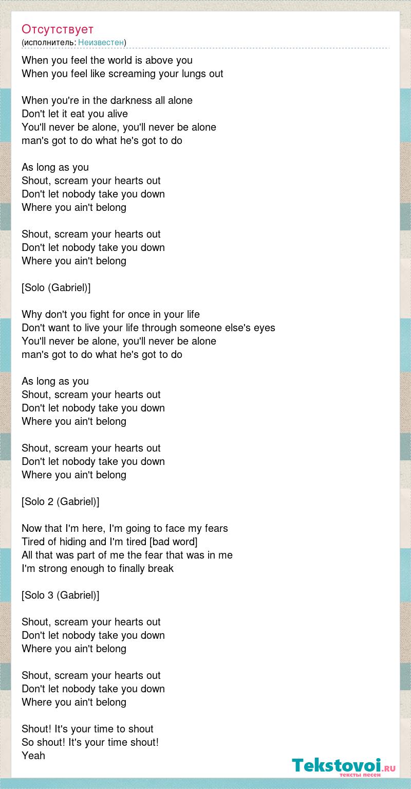 When you feel the world is above you When you feel like screaming your lungs out When you're in the darkness all alone Don't let it eat you alive You'll never be alone, you'll never be alone man's got to do what he's got to do As long as you Shout, scream your hearts out Don't let nobody take you down Where you ain't belong Shout, scream your hearts out Don't let nobody take you down Where you ain't belong [Solo (Gabriel)] Why don't you fight for once in your life Don't want to live your life through someone else's eyes You'll never be alone, you'll never be alone man's got to do what he's got to do As long as you Shout, scream your hearts out Don't let nobody take you down Where you ain't belong Shout, scream your hearts out Don't let nobody take you down Where you ain't belong [Solo 2 (Gabriel)] Now that I'm here, I'm going to face my fears Tired of hiding and I'm tired [bad word] All that was part of me the fear that was in me I'm strong enough to finally break [Solo 3 (Gabriel)] Shout, scream your hearts out Don't let nobody take you down Where you ain't belong Shout, scream your hearts out Don't let nobody take you down Where you ain't belong Shout! It's your time to shout So shout! It's your time shout! Yeah