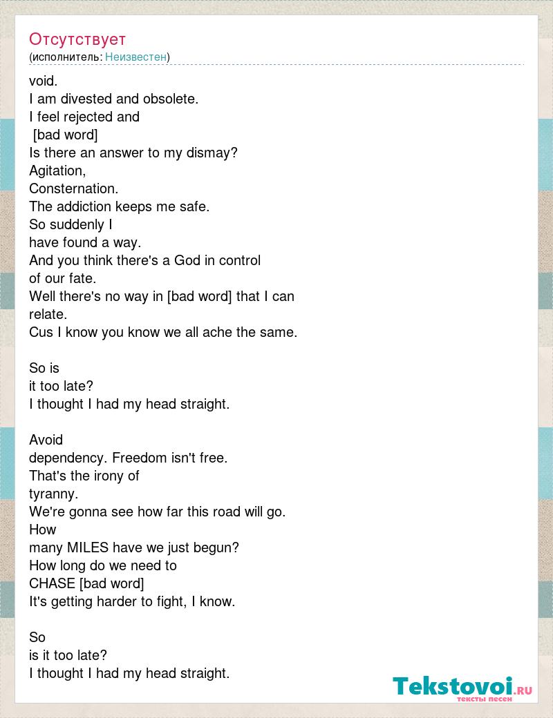 void. I am divested and obsolete. I feel rejected and [bad word] Is there an answer to my dismay? Agitation, Consternation. The addiction keeps me safe. So suddenly I have found a way. And you think there's a God in control of our fate. Well there's no way in [bad word] that I can relate. Cus I know you know we all ache the same. So is it too late? I thought I had my head straight. Avoid dependency. Freedom isn't free. That's the irony of tyranny. We're gonna see how far this road will go. How many MILES have we just begun? How long do we need to CHASE [bad word] It's getting harder to fight, I know. So is it too late? I thought I had my head straight.