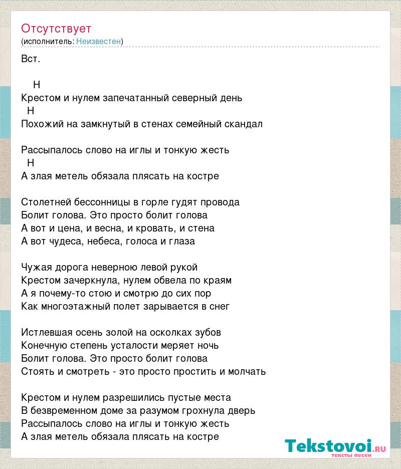 Вст. Н Крестом и нулем запечатанный северный день Н Похожий на замкнутый в стенах семейный скандал Рассыпалось слово на иглы и тонкую жесть Н А злая метель обязала плясать на костре Столетней бессонницы в горле гудят провода Болит голова. Это просто болит голова А вот и цена, и весна, и кровать, и стена А вот чудеса, небеса, голоса и глаза Чужая дорога неверною левой рукой Крестом зачеркнула, нулем обвела по краям А я почему-то стою и смотрю до сих пор Как многоэтажный полет зарывается в снег Истлевшая осень золой на осколках зубов Конечную степень усталости меряет ночь Болит голова. Это просто болит голова Стоять и смотреть - это просто простить и молчать Крестом и нулем разрешились пустые места В безвременном доме за разумом грохнула дверь Рассыпалось слово на иглы и тонкую жесть А злая метель обязала плясать на костре