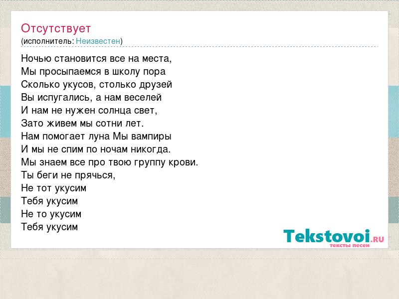 Ночью становится все на места, Мы просыпаемся в школу пора Сколько укусов, столько друзей Вы испугались, а нам веселей И нам не нужен солнца свет, Зато живем мы сотни лет. Нам помогает луна Мы вампиры И мы не спим по ночам никогда. Мы знаем все про твою группу крови. Ты беги не прячься, Не тот укусим Тебя укусим Не то укусим Тебя укусим