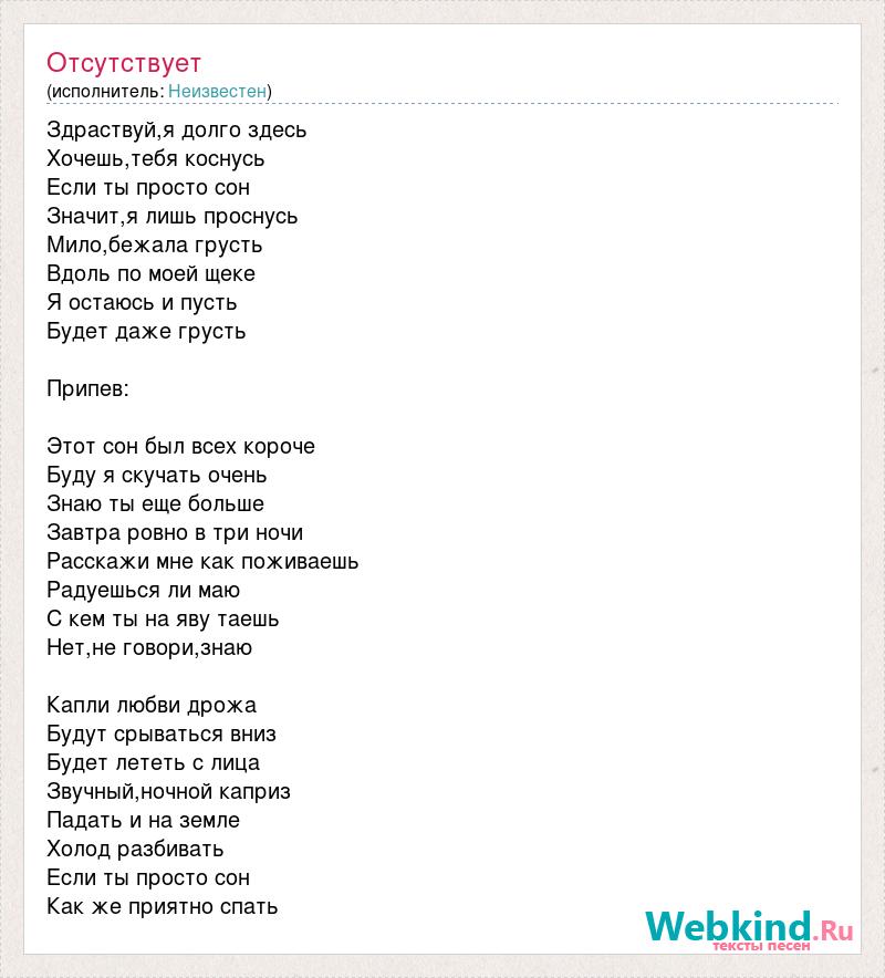 Здраствуй,я долго здесь Хочешь,тебя коснусь Если ты просто сон Значит,я лишь проснусь Мило,бежала грусть Вдоль по моей щеке Я остаюсь и пусть Будет даже грусть Припев: Этот сон был всех короче Буду я скучать очень Знаю ты еще больше Завтра ровно в три ночи Расскажи мне как поживаешь Радуешься ли маю С кем ты на яву таешь Нет,не говори,знаю Капли любви дрожа Будут срываться вниз Будет лететь с лица Звучный,ночной каприз Падать и на земле Холод разбивать Если ты просто сон Как же приятно спать