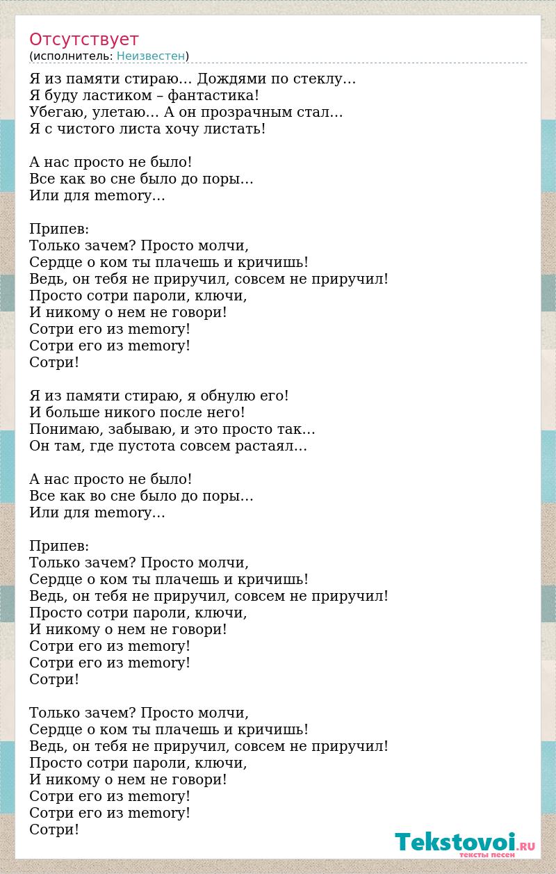 Я из памяти стираю… Дождями по стеклу… Я буду ластиком – фантастика! Убегаю, улетаю… А он прозрачным стал… Я с чистого листа хочу листать! А нас просто не было! Все как во сне было до поры… Или для memory… Припев: Только зачем? Просто молчи, Сердце о ком ты плачешь и кричишь! Ведь, он тебя не приручил, совсем не приручил! Просто сотри пароли, ключи, И никому о нем не говори! Сотри его из memory! Сотри его из memory! Сотри! Я из памяти стираю, я обнулю его! И больше никого после него! Понимаю, забываю, и это просто так… Он там, где пустота совсем растаял… А нас просто не было! Все как во сне было до поры… Или для memory… Припев: Только зачем? Просто молчи, Сердце о ком ты плачешь и кричишь! Ведь, он тебя не приручил, совсем не приручил! Просто сотри пароли, ключи, И никому о нем не говори! Сотри его из memory! Сотри его из memory! Сотри! Только зачем? Просто молчи, Сердце о ком ты плачешь и кричишь! Ведь, он тебя не приручил, совсем не приручил! Просто сотри пароли, ключи, И никому о нем не говори! Сотри его из memory! Сотри его из memory! Сотри!