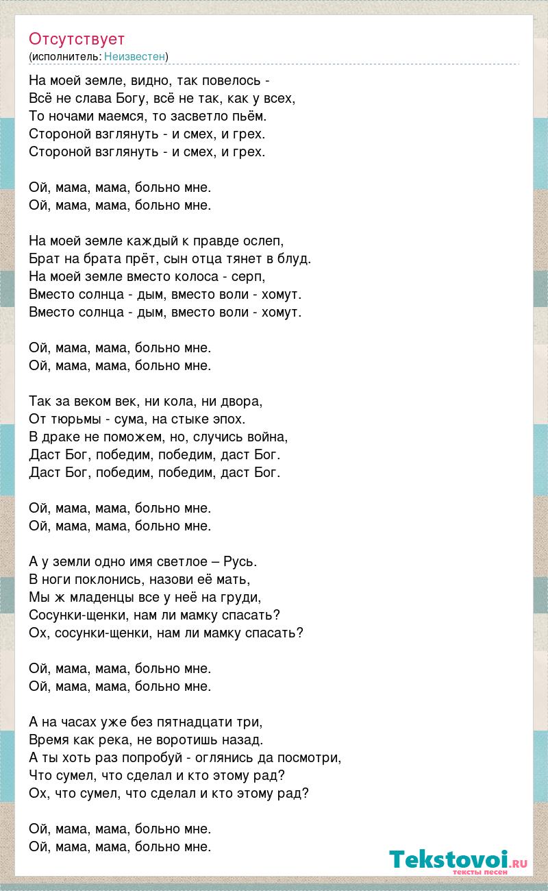 На моей земле, видно, так повелось - Всё не слава Богу, всё не так, как у всех, То ночами маемся, то засветло пьём. Стороной взглянуть - и смех, и грех. Стороной взглянуть - и смех, и грех. Ой, мама, мама, больно мне. Ой, мама, мама, больно мне. На моей земле каждый к правде ослеп, Брат на брата прёт, сын отца тянет в блуд. На моей земле вместо колоса - серп, Вместо солнца - дым, вместо воли - хомут. Вместо солнца - дым, вместо воли - хомут. Ой, мама, мама, больно мне. Ой, мама, мама, больно мне. Так за веком век, ни кола, ни двора, От тюрьмы - сума, на стыке эпох. В драке не поможем, но, случись война, Даст Бог, победим, победим, даст Бог. Даст Бог, победим, победим, даст Бог. Ой, мама, мама, больно мне. Ой, мама, мама, больно мне. А у земли одно имя светлое – Русь. В ноги поклонись, назови её мать, Мы ж младенцы все у неё на груди, Сосунки-щенки, нам ли мамку спасать? Ох, сосунки-щенки, нам ли мамку спасать? Ой, мама, мама, больно мне. Ой, мама, мама, больно мне. А на часах уже без пятнадцати три, Время как река, не воротишь назад. А ты хоть раз попробуй - оглянись да посмотри, Что сумел, что сделал и кто этому рад? Ох, что сумел, что сделал и кто этому рад? Ой, мама, мама, больно мне. Ой, мама, мама, больно мне.