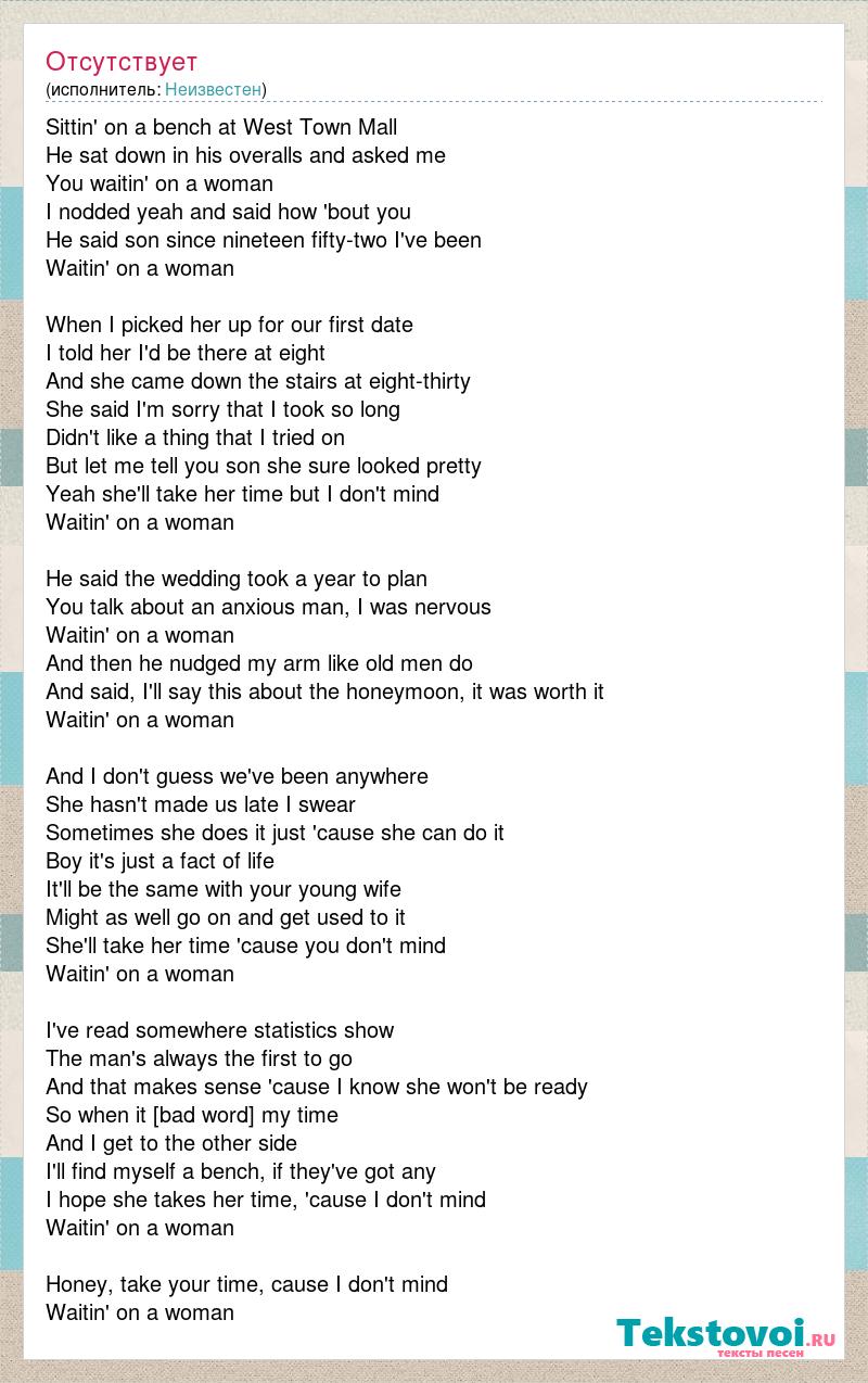 Sittin' on a bench at West Town Mall He sat down in his overalls and asked me You waitin' on a woman I nodded yeah and said how 'bout you He said son since nineteen fifty-two I've been Waitin' on a woman When I picked her up for our first date I told her I'd be there at eight And she came down the stairs at eight-thirty She said I'm sorry that I took so long Didn't like a thing that I tried on But let me tell you son she sure looked pretty Yeah she'll take her time but I don't mind Waitin' on a woman He said the wedding took a year to plan You talk about an anxious man, I was nervous Waitin' on a woman And then he nudged my arm like old men do And said, I'll say this about the honeymoon, it was worth it Waitin' on a woman And I don't guess we've been anywhere She hasn't made us late I swear Sometimes she does it just 'cause she can do it Boy it's just a fact of life It'll be the same with your young wife Might as well go on and get used to it She'll take her time 'cause you don't mind Waitin' on a woman I've read somewhere statistics show The man's always the first to go And that makes sense 'cause I know she won't be ready So when it [bad word] my time And I get to the other side I'll find myself a bench, if they've got any I hope she takes her time, 'cause I don't mind Waitin' on a woman Honey, take your time, cause I don't mind Waitin' on a woman