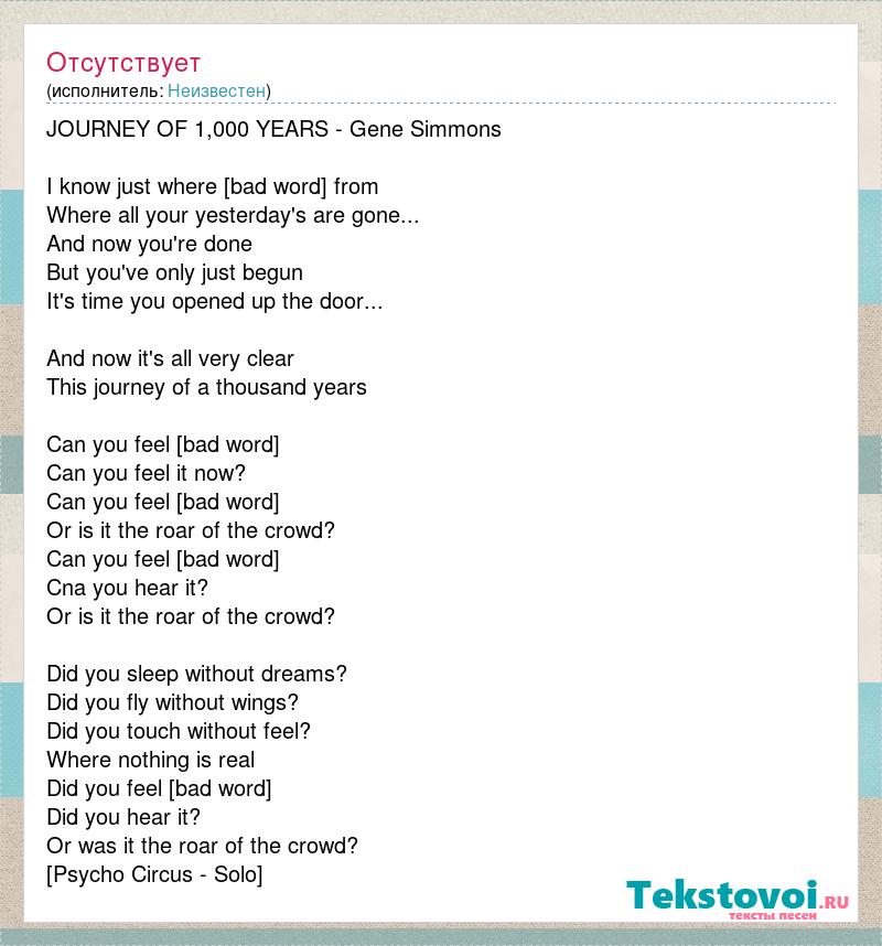 JOURNEY OF 1,000 YEARS - Gene Simmons I know just where [bad word] from Where all your yesterday's are gone... And now you're done But you've only just begun It's time you opened up the door... And now it's all very clear This journey of a thousand years Can you feel [bad word] Can you feel it now? Can you feel [bad word] Or is it the roar of the crowd? Can you feel [bad word] Cna you hear it? Or is it the roar of the crowd? Did you sleep without dreams? Did you fly without wings? Did you touch without feel? Where nothing is real Did you feel [bad word] Did you hear it? Or was it the roar of the crowd? [Psycho Circus - Solo]