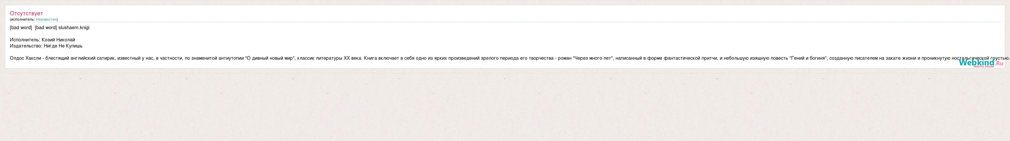 [bad word] [bad word] slushaem.knigi Исполнитель: Козий Николай Издательство: Нигде Не Купишь Олдос Хаксли - блестящий английский сатирик, известный у нас, в частности, по знаменитой антиутопии "О дивный новый мир", классик литературы XX века. Книга включает в себя одно из ярких произведений зрелого периода его творчества - роман "Через много лет", написанный в форме фантастической притчи, и небольшую изящную повесть "Гений и богиня", созданную писателем на закате жизни и проникнутую ностальгической грустью.
