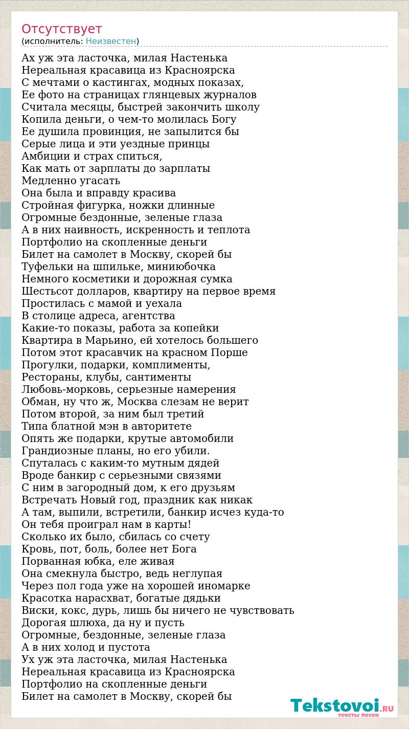 Ах уж эта ласточка, милая Настенька Нереальная красавица из Красноярска С мечтами о кастингах, модных показах, Ее фото на страницах глянцевых журналов Считала месяцы, быстрей закончить школу Копила деньги, о чем-то молилась Богу Ее душила провинция, не запылится бы Серые лица и эти уездные принцы Амбиции и страх спиться, Как мать от зарплаты до зарплаты Медленно угасать Она была и вправду красива Стройная фигурка, ножки длинные Огромные бездонные, зеленые глаза А в них наивность, искренность и теплота Портфолио на скопленные деньги Билет на самолет в Москву, скорей бы Туфельки на шпильке, миниюбочка Немного косметики и дорожная сумка Шестьсот долларов, квартиру на первое время Простилась с мамой и уехала В столице адреса, агентства Какие-то показы, работа за копейки Квартира в Марьино, ей хотелось большего Потом этот красавчик на красном Порше Прогулки, подарки, комплименты, Рестораны, клубы, сантименты Любовь-морковь, серьезные намерения Обман, ну что ж, Москва слезам не верит Потом второй, за ним был третий Типа блатной мэн в авторитете Опять же подарки, крутые автомобили Грандиозные планы, но его убили. Спуталась с каким-то мутным дядей Вроде банкир с серьезными связями С ним в загородный дом, к его друзьям Встречать Новый год, праздник как никак А там, выпили, встретили, банкир исчез куда-то Он тебя проиграл нам в карты! Сколько их было, сбилась со счету Кровь, пот, боль, более нет Бога Порванная юбка, еле живая Она смекнула быстро, ведь неглупая Через пол года уже на хорошей иномарке Красотка нарасхват, богатые дядьки Виски, кокс, дурь, лишь бы ничего не чувствовать Дорогая шлюха, да ну и пусть Огромные, бездонные, зеленые глаза А в них холод и пустота Ух уж эта ласточка, милая Настенька Нереальная красавица из Красноярска Портфолио на скопленные деньги Билет на самолет в Москву, скорей бы