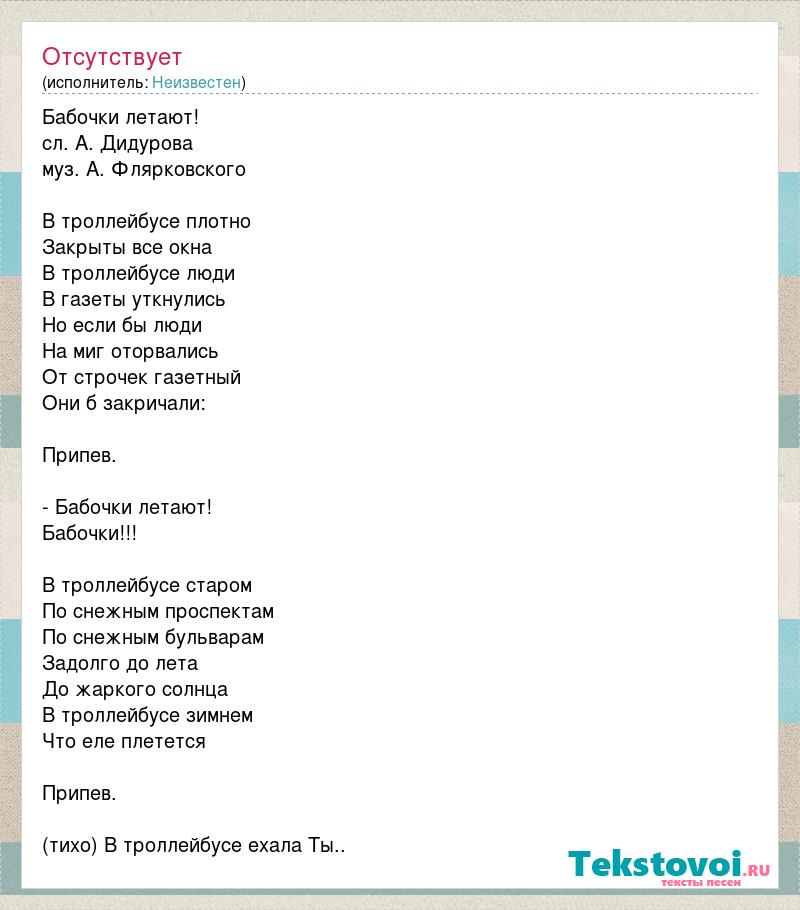 Бабочки летают! сл. А. Дидурова муз. А. Флярковского В троллейбусе плотно Закрыты все окна В троллейбусе люди В газеты уткнулись Но если бы люди На миг оторвались От строчек газетный Они б закричали: Припев. - Бабочки летают! Бабочки!!! В троллейбусе старом По снежным проспектам По снежным бульварам Задолго до лета До жаркого солнца В троллейбусе зимнем Что еле плетется Припев. (тихо) В троллейбусе ехала Ты..