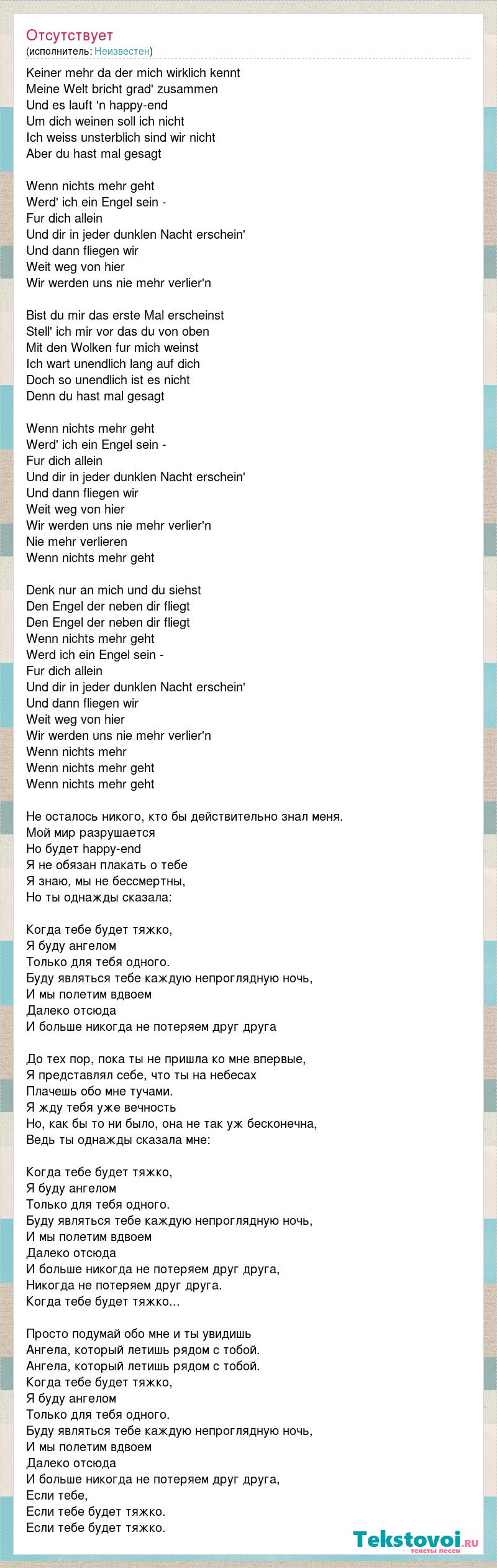 Keiner mehr da der mich wirklich kennt Meine Welt bricht grad' zusammen Und es lauft 'n happy-end Um dich weinen soll ich nicht Ich weiss unsterblich sind wir nicht Aber du hast mal gesagt Wenn nichts mehr geht Werd' ich ein Engel sein - Fur dich allein Und dir in jeder dunklen Nacht erschein' Und dann fliegen wir Weit weg von hier Wir werden uns nie mehr verlier'n Bist du mir das erste Mal erscheinst Stell' ich mir vor das du von oben Mit den Wolken fur mich weinst Ich wart unendlich lang auf dich Doch so unendlich ist es nicht Denn du hast mal gesagt Wenn nichts mehr geht Werd' ich ein Engel sein - Fur dich allein Und dir in jeder dunklen Nacht erschein' Und dann fliegen wir Weit weg von hier Wir werden uns nie mehr verlier'n Nie mehr verlieren Wenn nichts mehr geht Denk nur an mich und du siehst Den Engel der neben dir fliegt Den Engel der neben dir fliegt Wenn nichts mehr geht Werd ich ein Engel sein - Fur dich allein Und dir in jeder dunklen Nacht erschein' Und dann fliegen wir Weit weg von hier Wir werden uns nie mehr verlier'n Wenn nichts mehr Wenn nichts mehr geht Wenn nichts mehr geht Не осталось никого, кто бы действительно знал меня. Мой мир разрушается Но будет happy-end Я не обязан плакать о тебе Я знаю, мы не бессмертны, Но ты однажды сказала: Когда тебе будет тяжко, Я буду ангелом Только для тебя одного. Буду являться тебе каждую непроглядную ночь, И мы полетим вдвоем Далеко отсюда И больше никогда не потеряем друг друга До тех пор, пока ты не пришла ко мне впервые, Я представлял себе, что ты на небесах Плачешь обо мне тучами. Я жду тебя уже вечность Но, как бы то ни было, она не так уж бесконечна, Ведь ты однажды сказала мне: Когда тебе будет тяжко, Я буду ангелом Только для тебя одного. Буду являться тебе каждую непроглядную ночь, И мы полетим вдвоем Далеко отсюда И больше никогда не потеряем друг друга, Никогда не потеряем друг друга. Когда тебе будет тяжко... Просто подумай обо мне и ты увидишь Ангела, который летишь рядом с тобой. Ангела, который летишь рядом с тобой. Когда тебе будет тяжко, Я буду ангелом Только для тебя одного. Буду являться тебе каждую непроглядную ночь, И мы полетим вдвоем Далеко отсюда И больше никогда не потеряем друг друга, Если тебе, Если тебе будет тяжко. Если тебе будет тяжко.