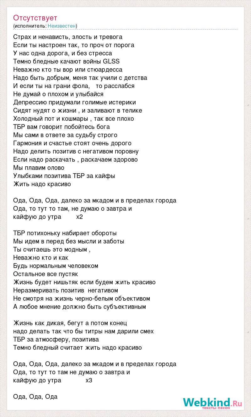 Страх и ненависть, злость и тревога Если ты настроен так, то проч от порога У нас одна дорога, и без стресса Темно бледные качают войны GLSS Неважно кто ты вор или стюардесса Надо быть добрым, меня так учили с детства И если ты на грани фола, то расслабся Не думай о плохом и улыбайся Депрессию придумали голимые истерики Сидят нудят о жизни , и заливают в телике Холодный пот и кошмары , так все плохо ТБР вам говорит побойтесь бога Мы сами в ответе за судьбу строго Гармония и счастье стоят очень дорого Надо делить позитив с негативом поровну Если надо раскачать , раскачаем здорово Мы плавим олово Улыбками позитива ТБР за кайфы Жить надо красиво Ода, Ода, Ода, далеко за мкадом и в пределах города Ода, то тут то там, не думаю о завтра и кайфую до утра х2 ТБР потихоньку набирает обороты Мы идем в перед без мысли и заботы Ты считаешь это модным , Неважно кто и как Будь нормальным человеком Остальное все пустяк Жизнь будет нишьтяк если будем жить красиво Неразмеривать позитив негативом Не смотря на жизнь черно-белым объективом А любое мнение должно быть субъективным Жизнь как дикая, бегут а потом конец надо делать так что бы титры нам дарили смех ТБР за атмосферу, позитива Темно бледный считает жить надо красиво Ода, Ода, Ода, далеко за мкадом и в пределах города Ода, то тут то там не думаю о завтра и кайфую до утра х3 Ода, Ода, Ода