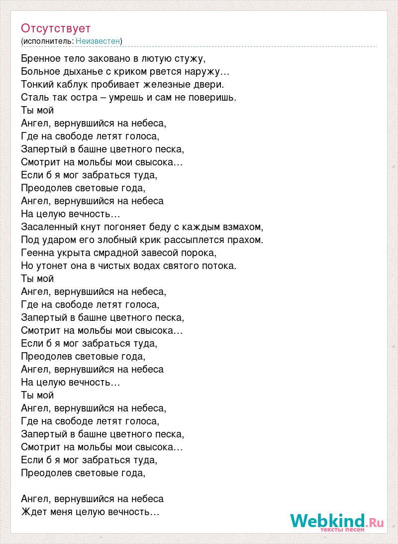 Бренное тело заковано в лютую стужу, Больное дыханье с криком рвется наружу… Тонкий каблук пробивает железные двери. Сталь так остра – умрешь и сам не поверишь. Ты мой Ангел, вернувшийся на небеса, Где на свободе летят голоса, Запертый в башне цветного песка, Смотрит на мольбы мои свысока… Если б я мог забраться туда, Преодолев световые года, Ангел, вернувшийся на небеса На целую вечность… Засаленный кнут погоняет беду с каждым взмахом, Под ударом его злобный крик рассыплется прахом. Геенна укрыта смрадной завесой порока, Но утонет она в чистых водах святого потока. Ты мой Ангел, вернувшийся на небеса, Где на свободе летят голоса, Запертый в башне цветного песка, Смотрит на мольбы мои свысока… Если б я мог забраться туда, Преодолев световые года, Ангел, вернувшийся на небеса На целую вечность… Ты мой Ангел, вернувшийся на небеса, Где на свободе летят голоса, Запертый в башне цветного песка, Смотрит на мольбы мои свысока… Если б я мог забраться туда, Преодолев световые года, Ангел, вернувшийся на небеса Ждет меня целую вечность…