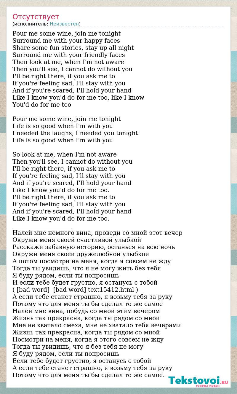 Pour me some wine, join me tonight Surround me with your happy faces Share some fun stories, stay up all night Surround me with your friendly faces Then look at me, when I'm not aware Then you'll see, I cannot do without you I'll be right there, if you ask me to If you're feeling sad, I'll stay with you And if you're scared, I'll hold your hand Like I know you'd do for me too, like I know You'd do for me too Pour me some wine, join me tonight Life is so good when I'm with you I needed the laughs, I needed you tonight Life is so good when I'm with you So look at me, when I'm not aware Then you'll see, I cannot do without you I'll be right there, if you ask me to If you're feeling sad, I'll stay with you And if you're scared, I'll hold your hand Like I know you'd do for me too. I'll be right there, if you ask me to If you're feeling sad, I'll stay with you And if you're scared, I'll hold your hand Like I know you'd do for me too. ____________________ Налей мне немного вина, проведи со мной этот вечер Окружи меня своей счастливой улыбкой Расскажи забавную историю, останься на всю ночь Окружи меня своей дружелюбной улыбкой А потом посмотри на меня, когда я совсем не жду Тогда ты увидишь, что я не могу жить без тебя Я буду рядом, если ты попросишь И если тебе будет грустно, я останусь с тобой ( [bad word] [bad word] text15412.html ) А если тебе станет страшно, я возьму тебя за руку Потому что для меня ты бы сделал то же самое Налей мне вина, побудь со мной этим вечером Жизнь так прекрасна, когда ты рядом со мной Мне не хватало смеха, мне не хватало тебя вечерами Жизнь так прекрасна, когда ты рядом со мной Посмотри на меня, когда я этого совсем не жду Тогда ты увидишь, что я без тебя не могу Я буду рядом, если ты попросишь Если тебе будет грустно, я останусь с тобой А если тебе станет страшно, я возьму тебя за руку Потому что для меня ты бы сделал то же самое.