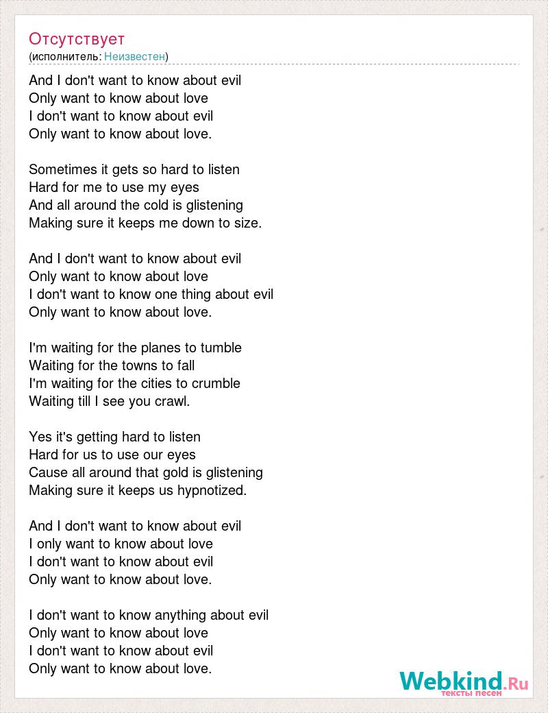 And I don't want to know about evil Only want to know about love I don't want to know about evil Only want to know about love. Sometimes it gets so hard to listen Hard for me to use my eyes And all around the cold is glistening Making sure it keeps me down to size. And I don't want to know about evil Only want to know about love I don't want to know one thing about evil Only want to know about love. I'm waiting for the planes to tumble Waiting for the towns to fall I'm waiting for the cities to [bad word] Waiting till I see you crawl. Yes it's getting hard to listen Hard for us to use our eyes Cause all around that gold is glistening Making sure it keeps us hypnotized. And I don't want to know about evil I only want to know about love I don't want to know about evil Only want to know about love. I don't want to know anything about evil Only want to know about love I don't want to know about evil Only want to know about love.