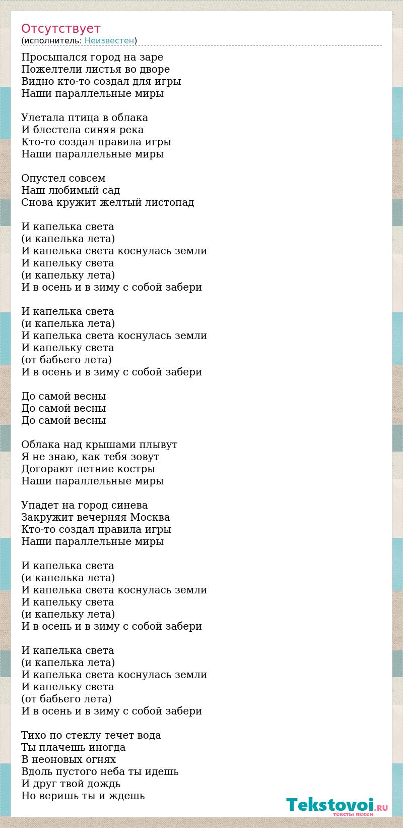 Просыпался город на заре Пожелтели листья во дворе Видно кто-то создал для игры Наши параллельные миры Улетала птица в облака И блестела синяя река Кто-то создал правила игры Наши параллельные миры Опустел совсем Наш любимый сад Снова кружит желтый листопад И капелька света (и капелька лета) И капелька света коснулась земли И капельку света (и капельку лета) И в осень и в зиму с собой забери И капелька света (и капелька лета) И капелька света коснулась земли И капельку света (от бабьего лета) И в осень и в зиму с собой забери До самой весны До самой весны До самой весны Облака над крышами плывут Я не знаю, как тебя зовут Догорают летние костры Наши параллельные миры Упадет на город синева Закружит вечерняя Москва Кто-то создал правила игры Наши параллельные миры И капелька света (и капелька лета) И капелька света коснулась земли И капельку света (и капельку лета) И в осень и в зиму с собой забери И капелька света (и капелька лета) И капелька света коснулась земли И капельку света (от бабьего лета) И в осень и в зиму с собой забери Тихо по стеклу течет вода Ты плачешь иногда В неоновых огнях Вдоль пустого неба ты идешь И друг твой дождь Но веришь ты и ждешь