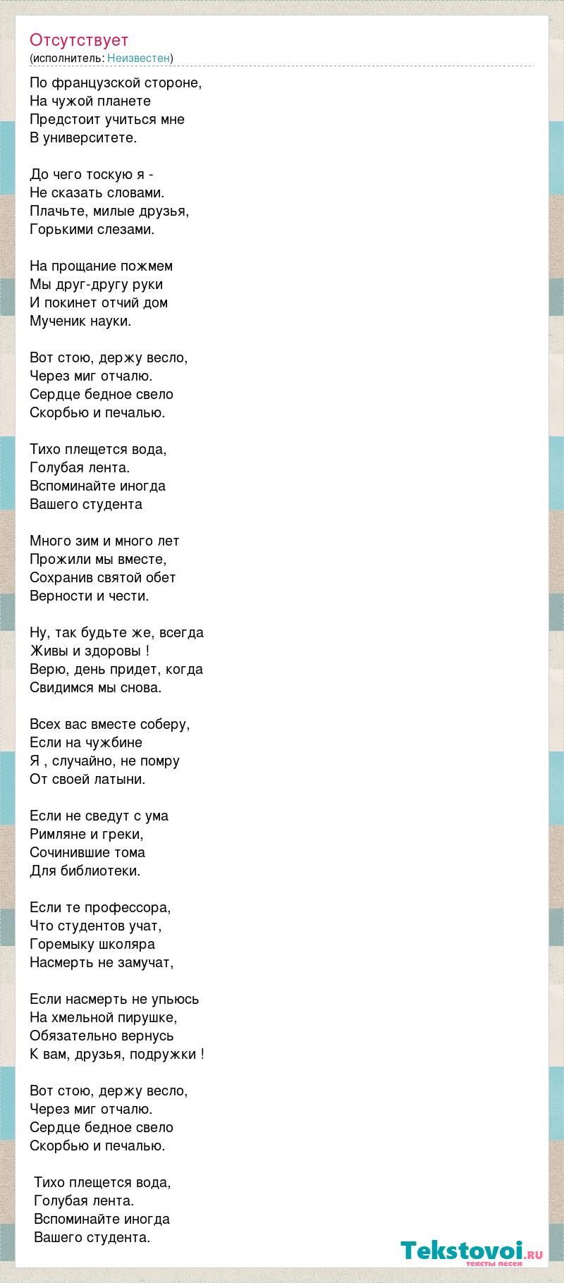 По французской стороне, На чужой планете Предстоит учиться мне В университете. До чего тоскую я - Не сказать словами. Плачьте, милые друзья, Горькими слезами. На прощание пожмем Мы друг-другу руки И покинет отчий дом Мученик науки. Вот стою, держу весло, Через миг отчалю. Сердце бедное свело Скорбью и печалью. Тихо плещется вода, Голубая лента. Вспоминайте иногда Вашего студента Много зим и много лет Прожили мы вместе, Сохранив святой обет Верности и чести. Ну, так будьте же, всегда Живы и здоровы ! Верю, день придет, когда Свидимся мы снова. Всех вас вместе соберу, Если на чужбине Я , случайно, не помру От своей латыни. Если не сведут с ума Римляне и греки, Сочинившие тома Для библиотеки. Если те профессора, Что студентов учат, Горемыку школяра Насмерть не замучат, Если насмерть не упьюсь На хмельной пирушке, Обязательно вернусь К вам, друзья, подружки ! Вот стою, держу весло, Через миг отчалю. Сердце бедное свело Скорбью и печалью. Тихо плещется вода, Голубая лента. Вспоминайте иногда Вашего студента.