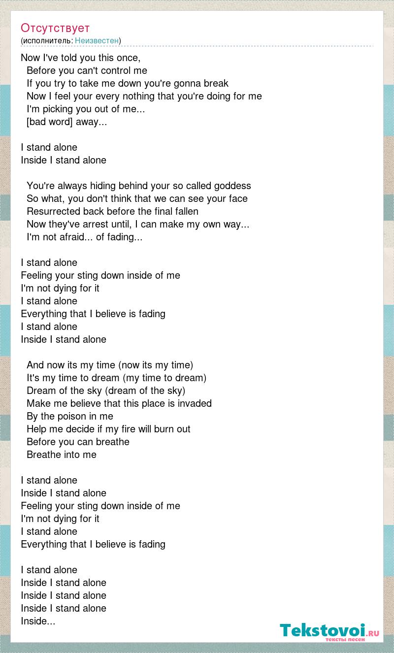 Now I've told you this once, Before you can't control me If you try to take me down you're gonna break Now I feel your every nothing that you're doing for me I'm picking you out of me... [bad word] away... I stand alone Inside I stand alone You're always hiding behind your so called goddess So what, you don't think that we can see your face Resurrected back before the final fallen Now they've arrest until, I can make my own way... I'm not afraid... of fading... I stand alone Feeling your sting down inside of me I'm not dying for it I stand alone Everything that I believe is fading I stand alone Inside I stand alone And now its my time (now its my time) It's my time to dream (my time to dream) Dream of the sky (dream of the sky) Make me believe that this place is invaded By the poison in me Help me decide if my fire will burn out Before you can breathe Breathe into me I stand alone Inside I stand alone Feeling your sting down inside of me I'm not dying for it I stand alone Everything that I believe is fading I stand alone Inside I stand alone Inside I stand alone Inside I stand alone Inside...