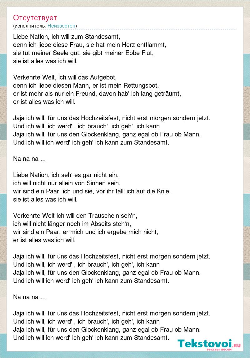 Liebe Nation, ich will zum Standesamt, denn ich liebe diese Frau, sie hat mein Herz entflammt, sie tut meiner Seele gut, sie gibt meiner Ebbe Flut, sie ist alles was ich will. Verkehrte Welt, ich will das Aufgebot, denn ich liebe diesen Mann, er ist mein Rettungsbot, er ist mehr als nur ein Freund, davon hab' ich lang geträumt, er ist alles was ich will. Jaja ich will, für uns das Hochzeitsfest, nicht erst morgen sondern jetzt. Und ich will, ich werd' , ich brauch', ich geh', ich kann Jaja ich will, für uns den Glockenklang, ganz egal ob Frau ob Mann. Und ich will ich werd' ich geh' ich kann zum Standesamt. Na na na ... Liebe Nation, ich seh' es gar nicht ein, ich will nicht nur allein von Sinnen sein, wir sind ein Paar, ich und sie, vor ihr fall' ich auf die Knie, sie ist alles was ich will. Verkehrte Welt ich will den Trauschein seh'n, ich will nicht länger noch im Abseits steh'n, wir sind ein Paar, er mich und ich ergebe mich nicht, er ist alles was ich will. Jaja ich will, für uns das Hochzeitsfest, nicht erst morgen sondern jetzt. Und ich will, ich werd' , ich brauch', ich geh', ich kann Jaja ich will, für uns den Glockenklang, ganz egal ob Frau ob Mann. Und ich will ich werd' ich geh' ich kann zum Standesamt. Na na na ... Jaja ich will, für uns das Hochzeitsfest, nicht erst morgen sondern jetzt. Und ich will, ich werd' , ich brauch', ich geh', ich kann Jaja ich will, für uns den Glockenklang, ganz egal ob Frau ob Mann. Und ich will ich werd' ich geh' ich kann zum Standesamt.