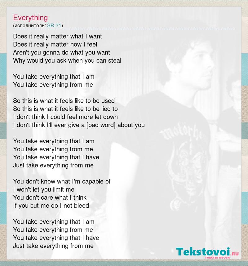 Does it really matter what I want Does it really matter how I feel Aren't you gonna do what you want Why would you ask when you can steal You take everything that I am You take everything from me So this is what it feels like to be used So this is what it feels like to be lied to I don't think I could feel more let down I don't think I'll ever give a [bad word] about you You take everything that I am You take everything from me You take everything that I have Just take everything from me You don't know what I'm capable of I won't let you limit me You don't care what I think If you cut me do I not bleed You take everything that I am You take everything from me You take everything that I have Just take everything from me