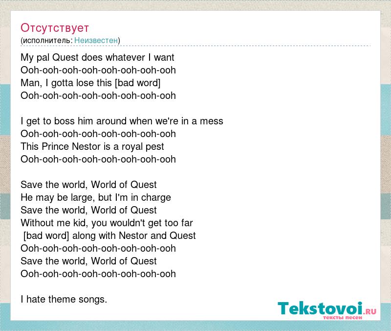 My pal Quest does whatever I want Ooh-ooh-ooh-ooh-ooh-ooh-ooh-ooh Man, I gotta lose this [bad word] Ooh-ooh-ooh-ooh-ooh-ooh-ooh-ooh I get to boss him around when we're in a mess Ooh-ooh-ooh-ooh-ooh-ooh-ooh-ooh This Prince Nestor is a royal pest Ooh-ooh-ooh-ooh-ooh-ooh-ooh-ooh Save the world, World of Quest He may be large, but I'm in charge Save the world, World of Quest Without me kid, you wouldn't get too far [bad word] along with Nestor and Quest Ooh-ooh-ooh-ooh-ooh-ooh-ooh-ooh Save the world, World of Quest Ooh-ooh-ooh-ooh-ooh-ooh-ooh-ooh I hate theme songs.