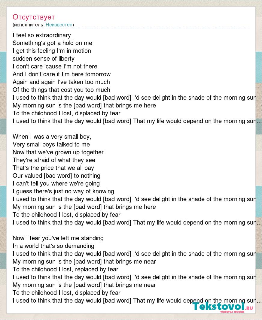 I feel so extraordinary Something's got a hold on me I get this feeling I'm in motion sudden sense of liberty I don't care 'cause I'm not there And I don't care if I'm here tomorrow Again and again I've taken too much Of the things that cost you too much I used to think that the day would [bad word] I'd see delight in the shade of the morning sun My morning sun is the [bad word] that brings me here To the childhood I lost, displaced by fear I used to think that the day would [bad word] That my life would depend on the morning sun... When I was a very small boy, Very small boys talked to me Now that we've grown up together They're afraid of what they see That's the price that we all pay Our valued [bad word] to nothing I can't tell you where we're going I guess there's just no way of knowing I used to think that the day would [bad word] I'd see delight in the shade of the morning sun My morning sun is the [bad word] that brings me here To the childhood I lost, displaced by fear I used to think that the day would [bad word] That my life would depend on the morning sun... Now I fear you've left me standing In a world that's so demanding I used to think that the day would [bad word] I'd see delight in the shade of the morning sun My morning sun is the [bad word] that brings me near To the childhood I lost, replaced by fear I used to think that the day would [bad word] I'd see delight in the shade of the morning sun My morning sun is the [bad word] that brings me near To the childhood I lost, displaced by fear I used to think that the day would [bad word] That my life would depend on the morning sun...