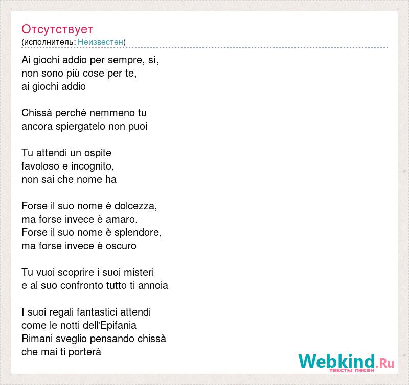Ai giochi addio per sempre, sì, non sono più cose per te, ai giochi addio Chissà perchè nemmeno tu ancora spiergatelo non puoi Tu attendi un ospite favoloso e incognito, non sai che nome ha Forse il suo nome è dolcezza, ma forse invece è amaro. Forse il suo nome è splendore, ma forse invece è oscuro Tu vuoi scoprire i suoi misteri e al suo confronto tutto ti annoia I suoi regali fantastici attendi [bad word] le notti dell'Epifania Rimani sveglio pensando chissà che mai ti porterà